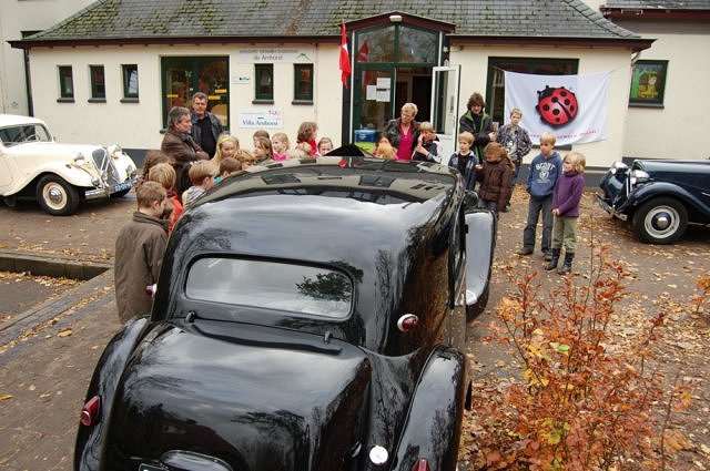 Diverse voorgerechtjes, Franse uiensoep, 2CV borst met dopperwten-munt puree / salades/ aardappel-garnituur, crèpes met amandelen, amaretto en ijs, kaasplankje. Al dit lekkers kwam vanuit de rode HY, steeds met uitleg door de kok Gert Jan en vlot uitgeserveerd door Aniek! Chapeau! Dit alles voorzien van een lekkere Merlot of gekoelde rosé maakten het tot een waar feestmaal! Het bleef lang gezellig met mooi uitzicht op de tractions in het licht van de ondergaande zon! Nadat de "thuis-slapers" vertrokken waren bij de tent nog even gezellig na-geborreld met weer wat andere specialiteiten, daarna dormir .... Rustig en relaxed opstaan, gewekt door de vele vogeltjes, prachtige camping! Even de bestelde verse croissantjes en een pistoletje halen bij de receptie, je waande je soms echt echt even in Frankrijk. Om 11 h maakten we de dag goed van een groep gehandicapten die ook op de camping verbleven door een ritje met ze te rijden. Inmiddels waren ook wat andere leden verschenen die aan de rit naar de frans dag in Hummelo gingen deelnemen. Na toespraak door Tom naast de wijze uil vertrok de kleurrijke stoet richting het oosten. Na ontbijt en koffieklets verzamelden zich rond 11.00 uur meer Tractions, die 12 verstandelijk gehandicapten en 5 begeleiders, die ook op het landgoed vertoefden, een rondritje door de omgeving aanboden. Dit werd zeer gewaardeerd en was voor de meesten een niet te vergeten belevenis.