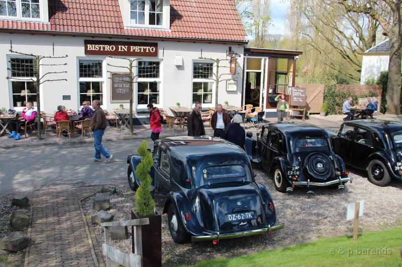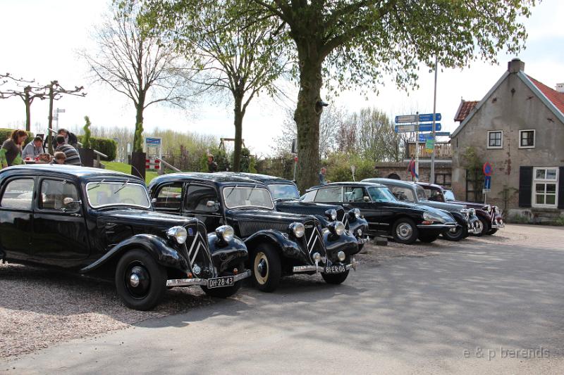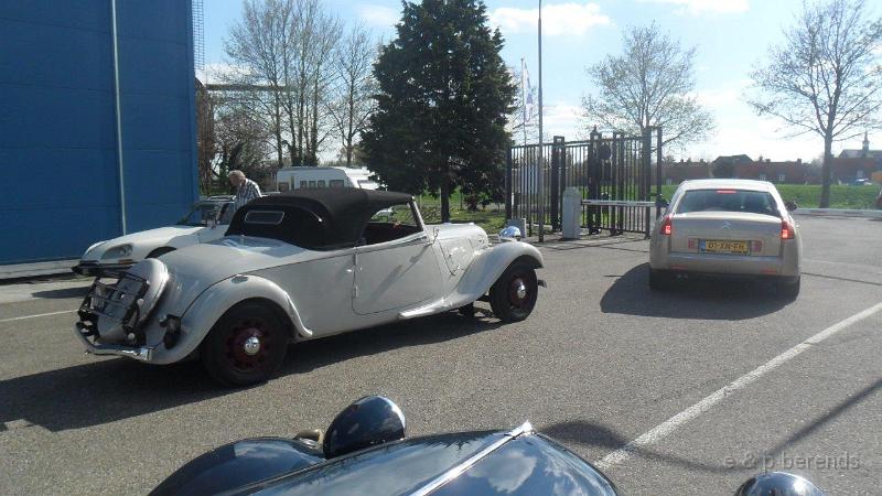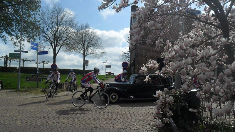 Zondagmorgen 28 april, zowaar lentezon op de P-plaats bij Mac Donalds in Ochten, uiteindelijk hadden er zich ca 25 equipes aangemeld voor de gezamenlijke VJ rit van Gelre & Midden. Behalve vele (kleurige) tractions ook één fraaie oude R4 en een zwart-wit DS duo! Snel weg van de snelweg en rustig toeren over Maas - en Waaldijken , door nog slaperige oude dorpjes en stadjes, vele fraaie panden en kasteeltjes langs de route. Onze belofte was waargemaakt overal volop bloesem! Op een flink stuk onverharde weg moesten de fietsers even plaats maken, sorry.....