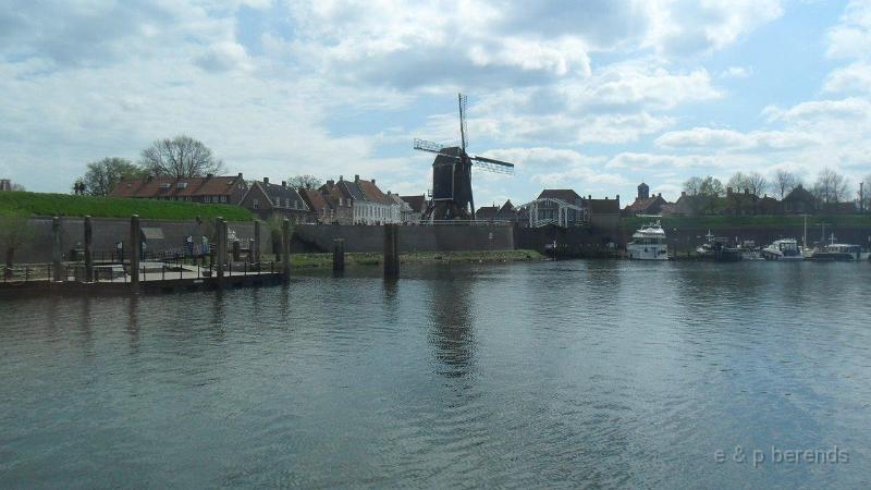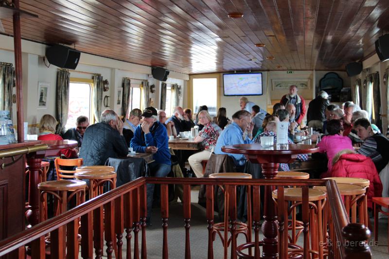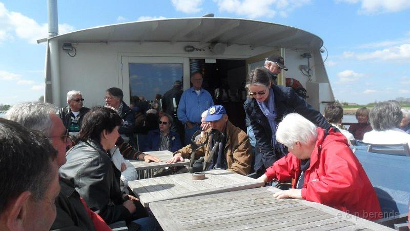 In Rossum werd bistro In Petto met een bezoek vereerd, Bourgondisch genieten stond er op het schoolbord. Er kon zowaar buiten gezeten worden, alleen even verstoord door de blauwe twee-takt dampen afkomstig van passerende oude nozems op prachtige Kreidlers en Zundapps! De rit werd vervolgd en tegen 13.00 h stond het hele wagenpark veilig (achter de hekken) geparkeerd van de scheepswerf te Heusden, keurig geregeld! Korte wandeling langs de stadswal met molens naar de aanlegsteiger van Wiljo. Daar gingen we aan boord van de Zeearend (uit 1954) om een mooie rondvaart te maken over Maas met uitleg over het geen we zagen. Koffie, thee, melk en lekkere broodjes werden ruimschoots geserveerd. Aan dek uit de wind en in het zonnetje was het heerlijk toeven! Genoeg te zien, veel pleziervaart en oude schepen op het water, mooie huizen langs de wal. Het eerste vee stond ook al in de wei of was aan het pootje baden!