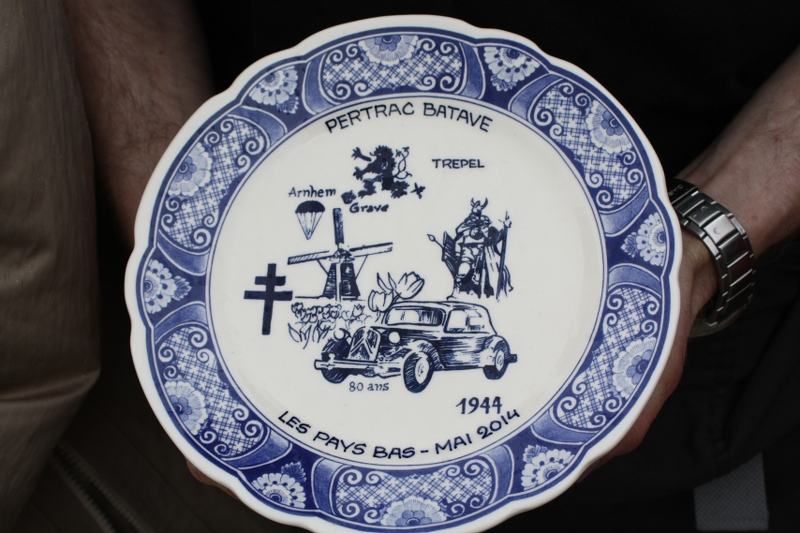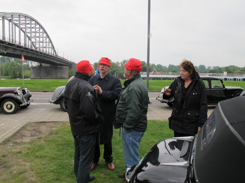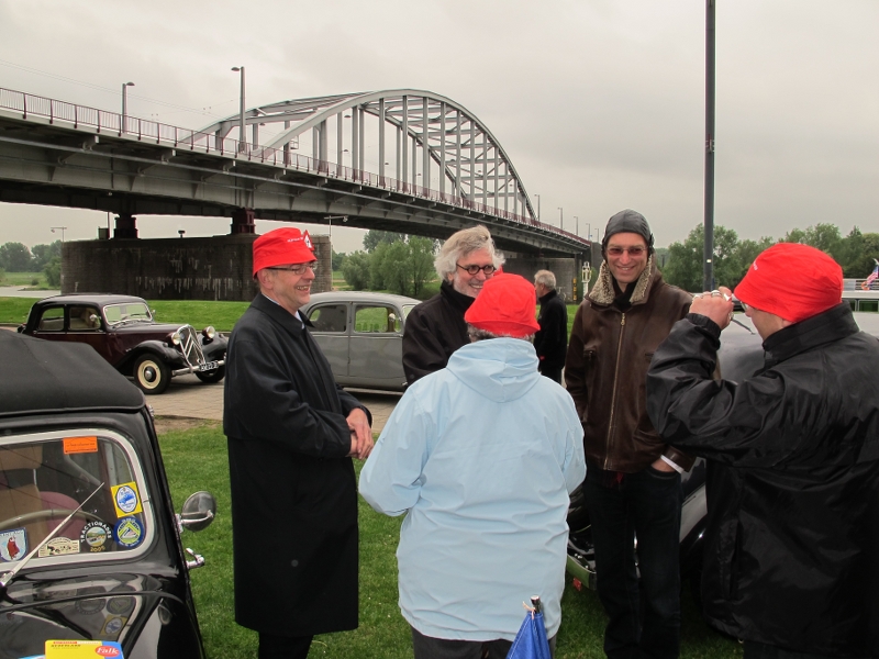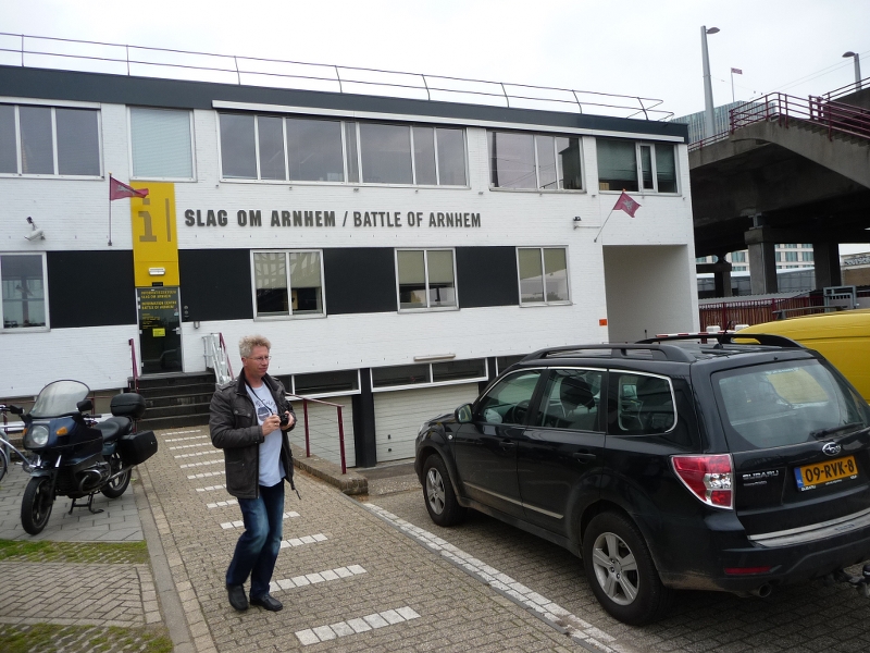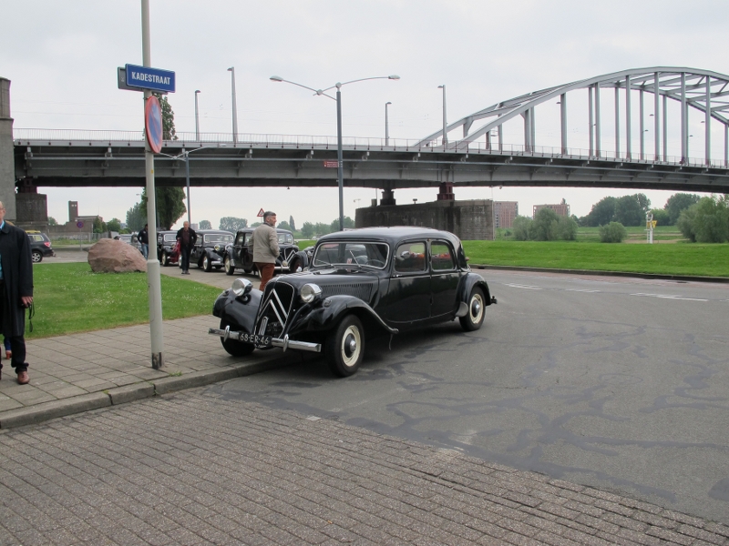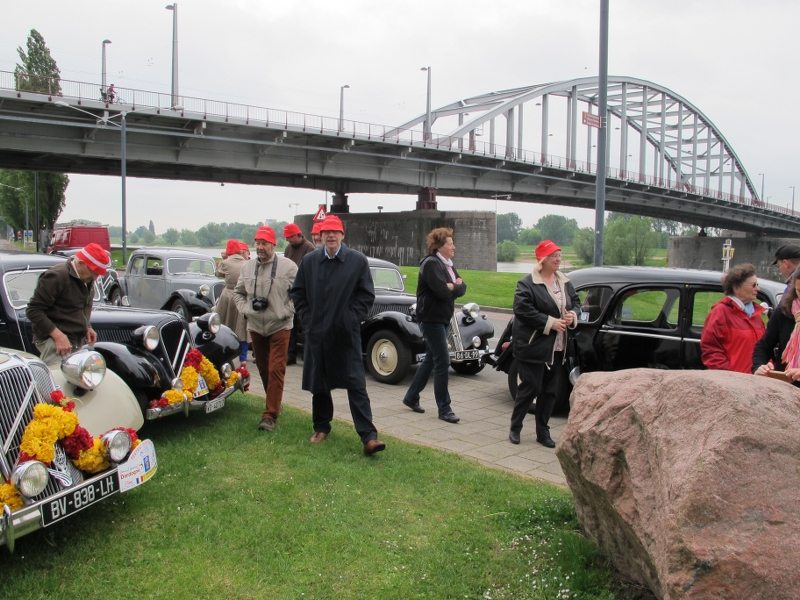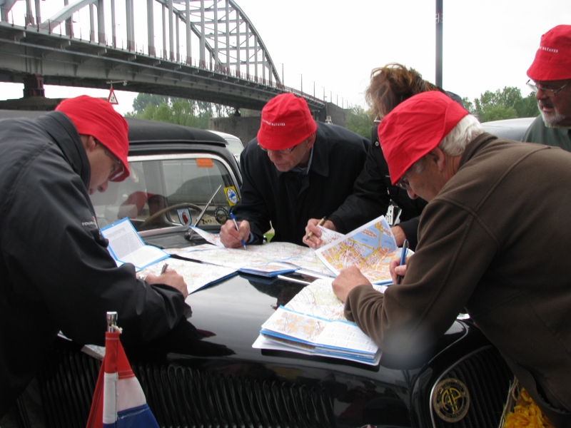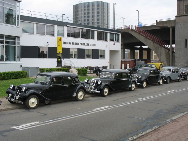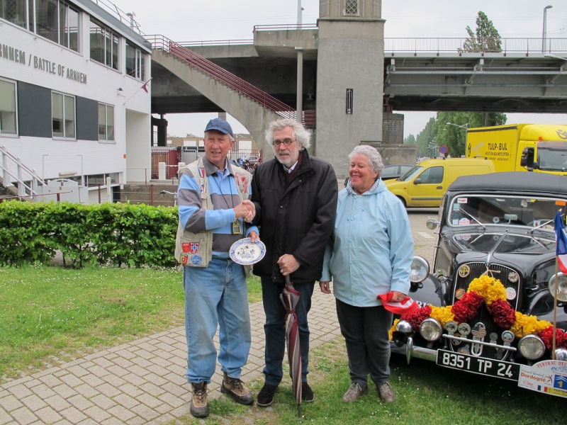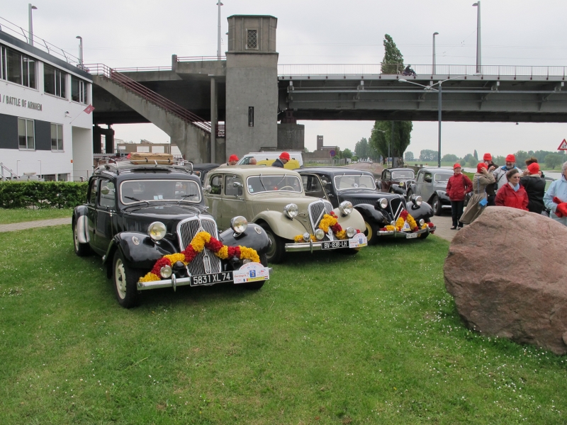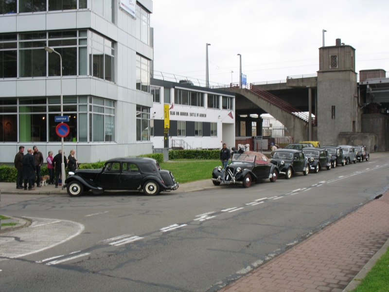 Arnhem verschenen we met 4 tractions, grote verrassing alleen Ronald wist ervan. Samen een glas wijn geheven en buiten de auto's bekeken, daarna moesten ze nog aan het dessert (Franse tijden!). Donderdag morgen - na wederom verzameld te hebben bij Tom de Haan reden er maar liefst 7 Gelre tractions naar het Market Garden info centrum net onder de John Frostbrug in Arnhem. Om 10.00 h zou een Arnhemse wethouder onze buitenlandse vrienden welkom heten, belangrijke personen zijn altijd te laat dat werd 10.30 h dus. Daarna ging de stoet van 11 tractions over de Rijnbrug , via de oude Rijksweg > Elst > naar de Waalbrug Nijmegen. De echte route van de geallieerden dus, (Herman Lelivelt was wederom de gids) vervolgens naar de landingsterreinen rondom Groesbeek > toen werd de brug bij Grave nog "ingenomen" en werd er bij CAS te Zeeland een koffie-stop gemaakt - maar het was inmiddels al ver in de middag! Hier namen we afscheid, de 4 tractions hadden Waterloo in Belgie als einddoel die dag.