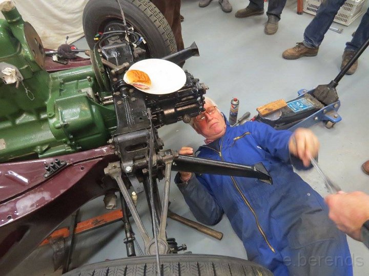 Op zaterdag 23 april hadden we sleutel”morgen” in de garage van Henk Hanenburg te Elst, adres kon niet missen gezien het enorme spandoek en de tractions op de oprit! Binnen stond de steeds mooie wordende nog in opbouw zijnde décapotable van Dick Appels, door Joop Tijssen effe getransporteerd en wat later volgde de motor dankzij Theo Schrijvers. Bedankt mannen!