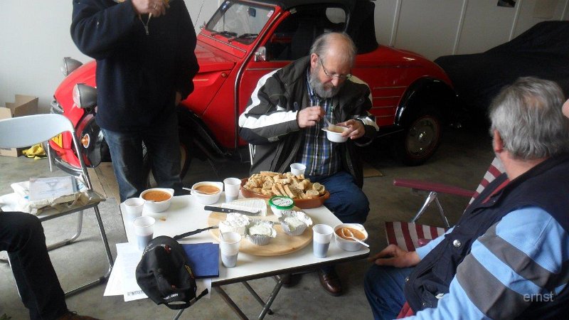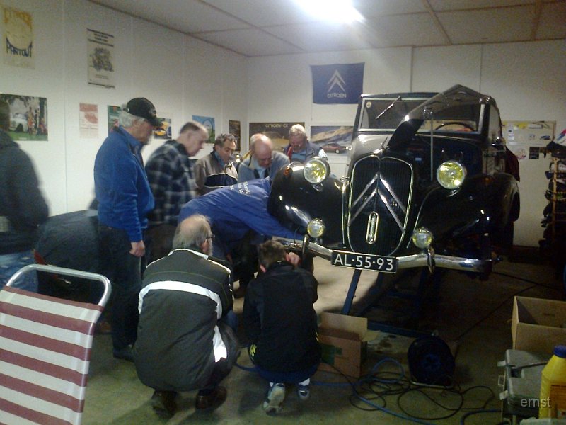 Al rond tienen bedrijvigheid aan de Klapstraat 26 in Elden, schuin tegenover onze afd. avond locatie De Kastelein waar we die avond ervoor nog geweest waren. Toen ruim 30 aandachtige toehoorders/sters voor Dick's Appels interessante verhaal over auto's op brandstofcellen. Tom had de Citroenvlag gehesen, dat kon dus niet missen en al snel stond het erf vol met voitures van allerlei makelij, alhoewel de Franse toch ruim overheersten! Binnen was er koffie met cake en stond Tom's traction op de hefbrug (een hele handige compacte trouwens!) Verder nog een snoek onder een hoes en een 2CV-cabrio met Hoffmann - carrosserie. Herman demonstreerde de aanwezigen hoe de voor-remtrommel eraf ging mbv ons speciale gereedschap. Er was zelfs een belangstellend lid van afd Rotterdam, die ook net met de remmen aan de gang wilde. Remzuigertje bleken muurvast in de remcilinders te zitten, we kregen dus ook een demo hoe zoiets opgelost dient te worden: met beleid eruit persen > zuigertjes op staalborstel schoonmaken, cilindertjes honen en dan uiteraard weer monteren met nieuwe cupjes en remvet. Het gesleutel werd onderbroken toen Anke de lunch de garage binnenbracht, overheerlijke zeer rijk gevulde soep, stokbrood met diverse kazen met daarbij een lekker Frans wijntje. We kwamen helaas een remcupje te kort om het karwei voor af te maken. Goede opkomst met 14 leden, na Tom & Anke met een lekkere fles Merlot bedankt te hebben voor de gastvrijheid en de lunch ging een ieder voldaan weer huiswaarts. Totaal 14 leden, een goede opkomst dus. Eerstvolgende Gelre evenement is de VJ rit samen met Midden, denken in totaal gezamenlijk zo'n 30 Tractions in beweging te krijgen op zondag 28 april. Er kan nog ingeschreven worden!