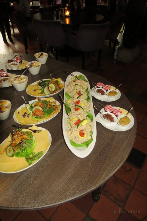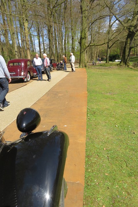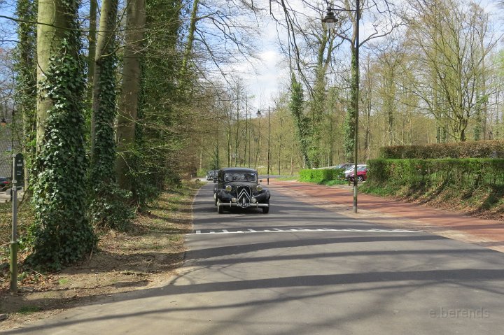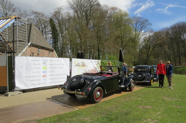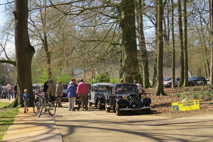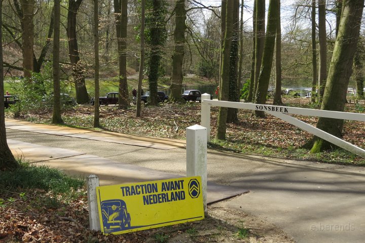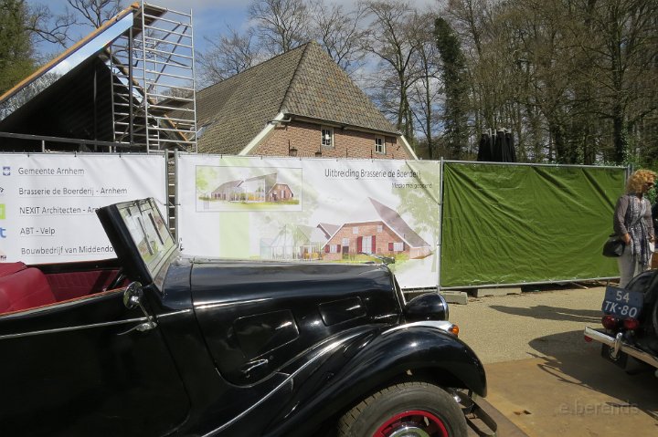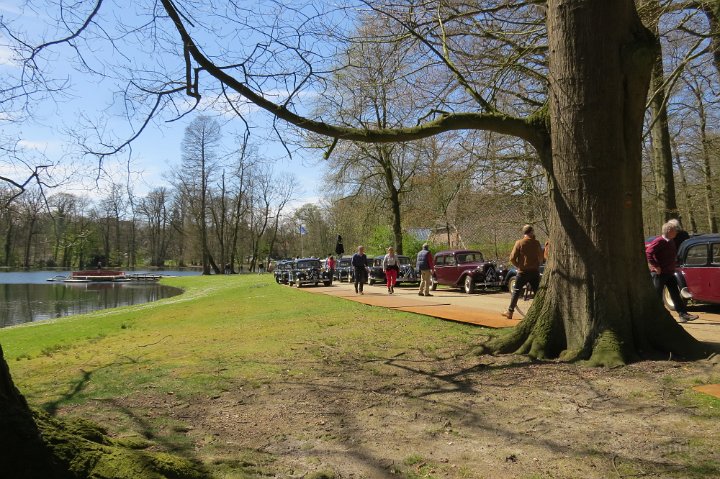 Al voor 11.30 stonden er al diverse tractions op de rijplaten voor De Boerderij aan de rand van park Sonsbeek in Arnhem. Hier vond dus exact 40 jaar geleden de oprichting van de toenmalige afd Arnhem plaats. Bij ons 25 jarige bestaan zijn we Gelre gaan heten, die vlag dekte de lading beter. Omdat er verbouwd werd bij De Boerderij lagen er rijplaten op het gazon aan weerszijden van voet/fietspad ervoor, dat was ons geluk want de tractions mochten daarop parkeren! Uiteindelijk 23 stuks een prachtig gezicht. Een fietser kwam met de melding dat er tractions stonden onder Zypse viaduct, waarvan één met pech! Toonde ons als bewijs een plaatje op zijn mobieltje, maar gelukkig kwam deze stoet even later compleet aanrijden. De Gelre vlag werd uiteraard gehesen aan onze mobiele vlaggenmast. Om 12.30 h opende het overheerlijke buffet dat binnen klaar stond voor de 44 inschrijvers, buiten in de zon dit dus gezellig verorberd, zo nu en dan weer wat bijhalen binnen, daarbij steeds even wennen aan de overgang van licht naar donker! Veel belangstelling van de vele voorbijgangers in het zon overgoten park. In de vijver tegenover De Boerderij ligt een drijvend podium, dat bleek mede ontworpen te zijn door Henk van der Krabben, een ex Gelre-lid die al weer jaren in Frankrijk woont en daar behalve een traction en een HY, vele eenden en diverse Peugeots heeft. Verhuurt gîtes, Solexen, van alles te beleven daar i n de Alliers, zie www.lalue.eu