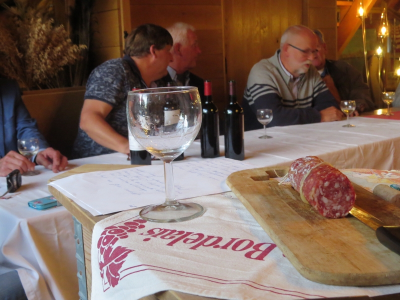 Daar van een zeer gezellige wijnproefavond genoten - René, een echte Fransman -in met 100 % Allo Allo accent gaf uitleg over de diverse wijnen en zijn Nederlandse vrouw verzorgde er passende hapjes bij. 2 rode, 2 witte, 1 zoete dessert-wijn en tot slot champagne werden geserveerd, in kleine glaasjes weliswaar maar niets werd uitgespuugd! Tom & Anke - per DS - werden op hun thuisreis in het dorp aangehouden om pijpje te blazen!. Anke blies ver onder de norm en Tom belde snel op om de nog aanwezigen te informeren om een andere route te kiezen! Familie Tersluisen had de caravan achter de Normale gehangen en bleven op het erf overnachten.