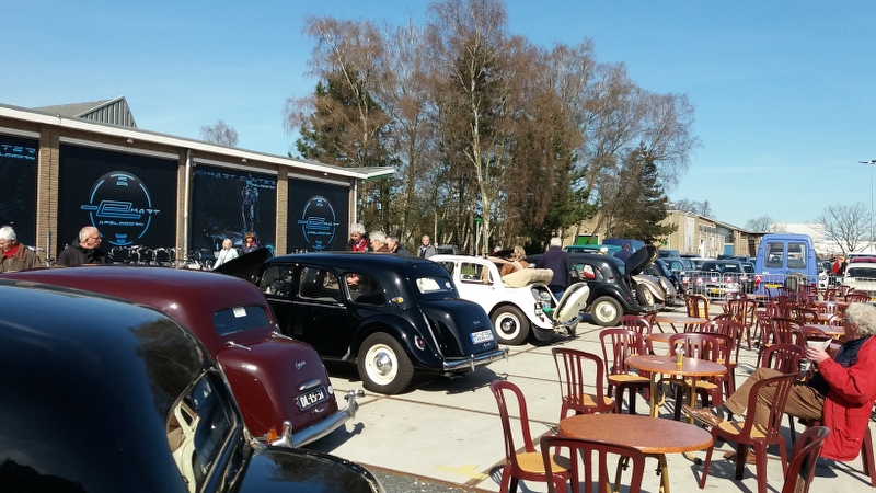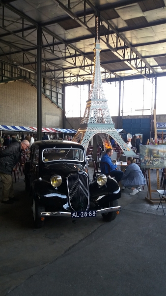 Via Alliance Francaise waren we uitgenodigd om 25 en 26 maart deel te nemen aan de Brocante in Apeldoorn op het terrein van de voormalige Zwitsal-fabriek. Het was mooi voorjaarsweer en samen met afdeling Oost hadden we er zaterdags een rijtje van 10 tractions staan! Prima plek bij de ingang en naast een terras. Diverse aparte modellen present zoals 4 en 6 cilinder cabrio’s, een zeer lange Pick Up, Engelse Slough Six, Familiale 1939. Binnen in de hal stond ook nog een vooroorlogs Sportje onder de Eiffeltoren. Veel aanloop van publiek, met de bekende verhalen: heb ik nog aan gesleuteld, mijn vader had er één etc.