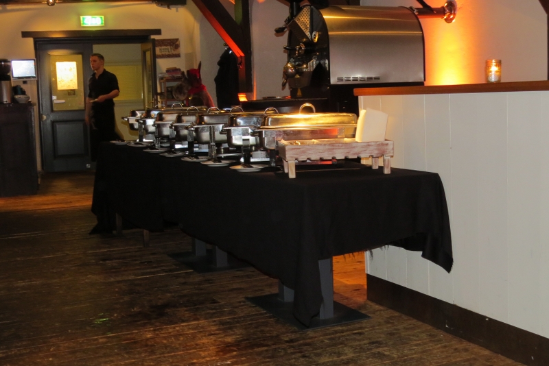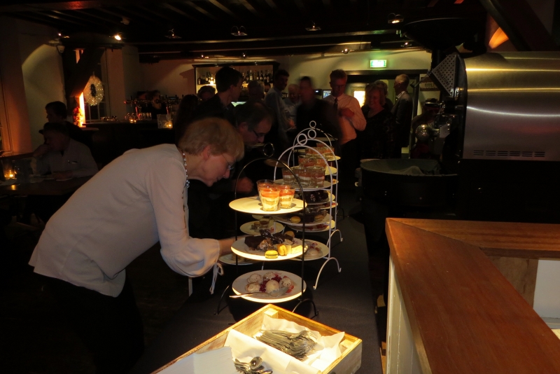 Genoten van de diverse gerechten; na de pompoensoep met brood en salades de keuze uit oa diverse vis - en vlees-gerechten, rode kool, stoofpeertjes, coq-au -vin, met als dessert zg etagères met allerlei lekkers!