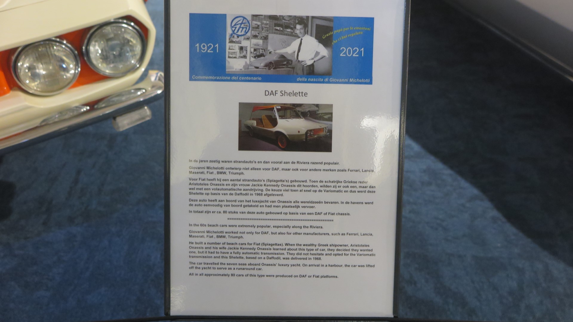 Tevens staan er veel aangepaste voertuigen zoals de DAF-Michelotti Shelette uit 1968, gebaseerd op de DAF 33. Voormalige eigenaren Aristoteles Onassis en Jackie Kennedy. Dit voertuig ging mee op hun jacht en werd in de havens van boord gehesen.