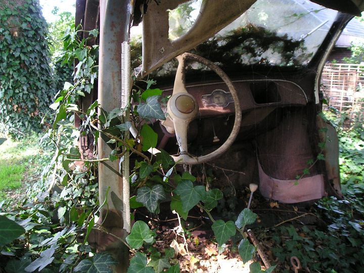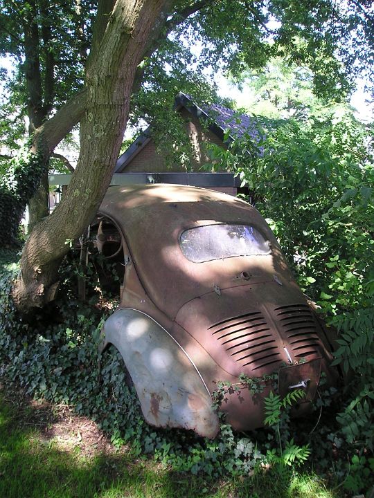 De achtertuin was inderdaad groot genoeg! Prachtig vrij uitzicht op een flink aantal paarden bovendien en elders in de tuin stond ook nog een bijna door de natuur teruggenomen Renault Quatre! In Theo's garage staat al een tijdje een beter exemplaar, - gespoten carrosserie - te wachten om weer opgebouwd te worden. Ook liefhebber van oude Mercedessen, zowel van schaalmodellen als van echte! De Traction stond onder de carport.