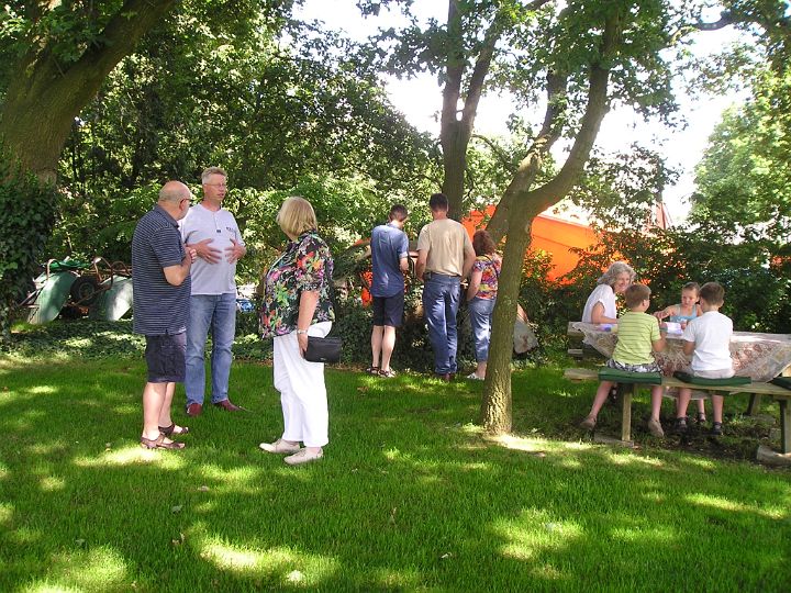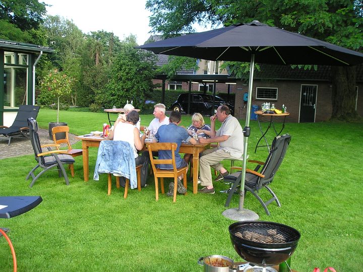 Uiteindelijk 20 volwassenen en 3 kinderen in de tuin, diverse tafels, parasols en inderdaad een dubbele Weber ( met wat startproblemen) Met vereende krachten van de superstokers werden de BBQ warm gestookt. In de keuken stond een enorme schaal met vers aangemaakte salade, diverse vleessalades, groente, stokbrood, drank - alles prima verzorgd door Theo en Maria. Zelfs frietjes voor de kinderen.