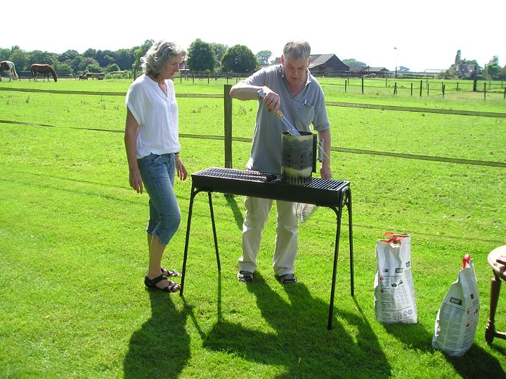 Toen de Webers op temperatuur worden kon het vlees erop, bij toerbeurt "bemanning" erbij want het gaat vaak snel te hard! Gezellig bijkletsen, Benno's mooie jonge Berner - Boefje geheten - gedroeg zich voorbeeldig en lag op flinke afstand toe te kijken zonder maar een keer te blaffen!