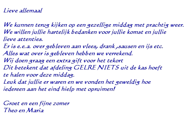Tegen 20.00 h namen de meesten afscheid, nog even koffie gedronken, Theo & Maria nogmaals hartelijk bedankt voor de perfecte organisatie. Zo was een ieder met volle maag en een tevreden gevoel mooi op tijd weer thuis om Nederland te zien winnen van Brazilië!