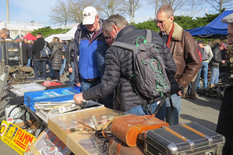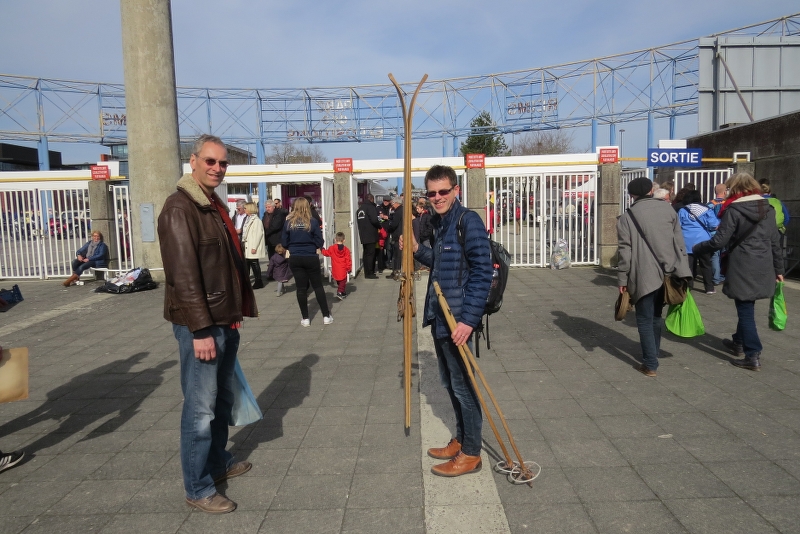 Ton de Haan en ondergetekende met Pim in zijn C4 Picasso vrijdag’s al afgereisd, voor ’t eerst door de nieuwe tunnel bij Maastricht, wat een verbetering! Luik blijft druk, rechter Maasoever dan weer de linker… Om 18.30 h ingecheckt bij ons hotel aan de Boulevard. Om 20.00 h hadden we de Gelre-tafel gereserveerd in ‘’ons” bekende restaurant bij de fontein. Daar met 9 personen gezellig gegeten, heel toevallig liep ook ex- Gelre lid - nu in Frankrijk woonachtig - Rob la Rütte daar ook binnen, kleine wereld toch! Na goede nachtrust en ontbijt naar de beurs. Eerst even op de oldtimer P-plaatsen gekeken, altijd interessant, stond maar weinig te koop dit keer! Prachtig lenteweer en druk op de beurs, duurt altijd over voor je binnen bent. E-ticket ingang nu drukker dan via de kassa! Vele bekenden ontmoet uit eigen -en buitenland. Nog steeds veel aanbod, waar het toch allemaal vandaan komt? Nu ook Franse herproduktie van de Kegresse rupsbanden, concurentie voor onze Deense vrienden? Zowaar ook nieuwe grilles voor de 22 CV te koop! Pim vond een setje historische ski’s voor op de imperiaal!