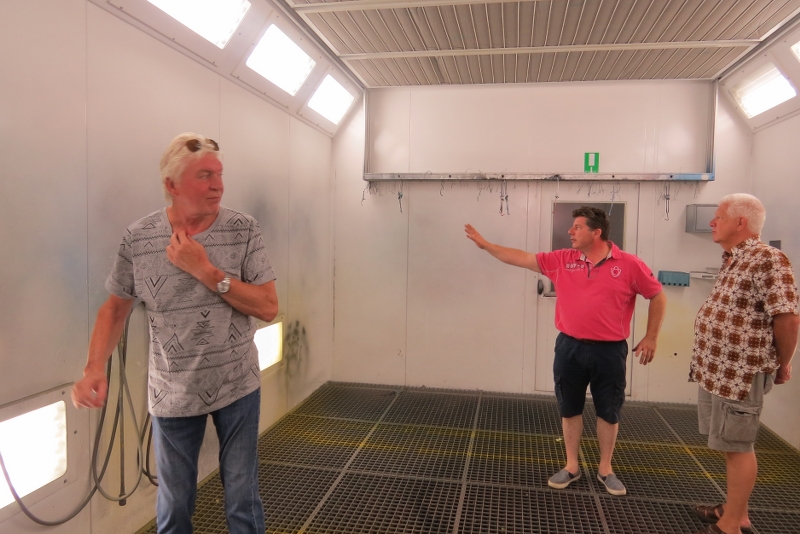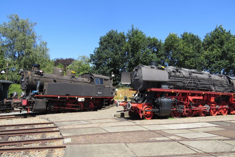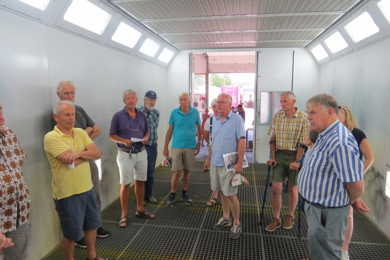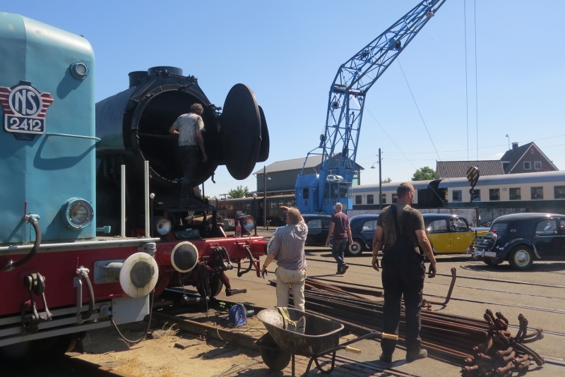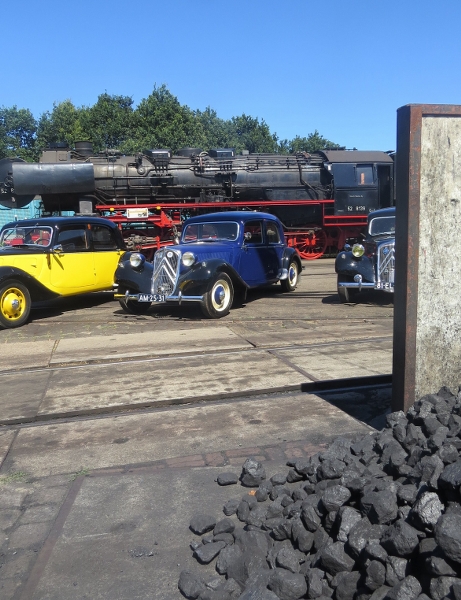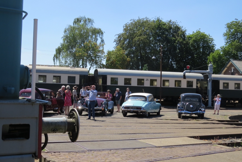 13.00 h - mooie route over vaak wat stoffige wegen naar Beekbergen/Lieren. Ontvangst en rondleiding bij Veluwse Stoomtrein Maatschappij. Kunnen wat tractions het terrein op, blijkt het maar en nietig voertuig te zijn naast die enorme stoomlocs! Allemaal iets lomper en zwaarder dan bij onze hobby... maar zeker niet minder interessant, ook niet vies van zwarte handen - en de rest - hier! Alles draait de (zwarte) handjes van vrijwilligers hier, ook sierlijke vrouwlijke zien we!
