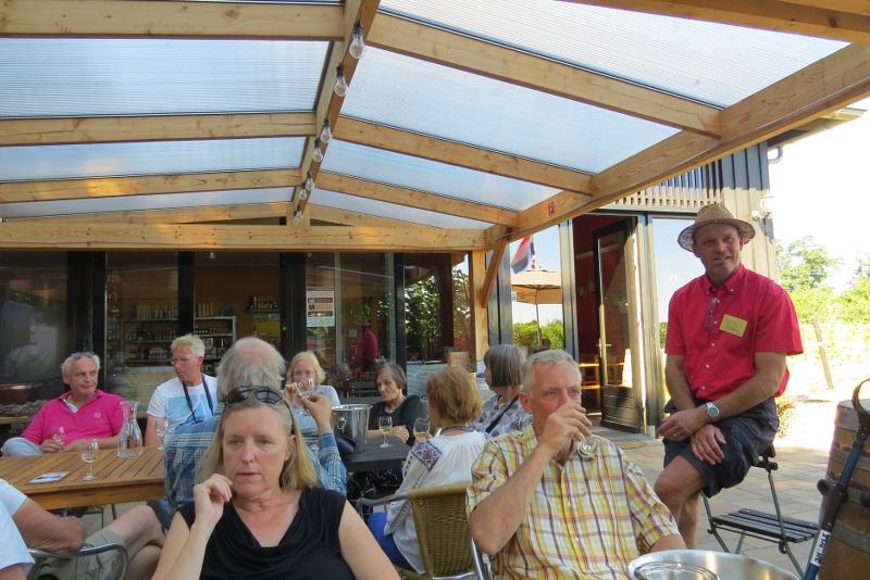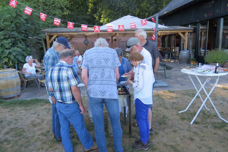 Na kort vervolg ritje tegen 17.00 h ontvangst op fraaie geheel ommuurde wijngaard Domein Hof te Dieren. De trossen hangen er al mooi bij, eerst proeverij van 3 soorten - daarna werd het vuur ontstoken tbv BBQ. Vele soorten vlees, lekkere salades, muziekje erbij, gezellig bijpraten, wijntje uiteraard en koffie na, Prachtige avond na een zeer geslaagde dag!