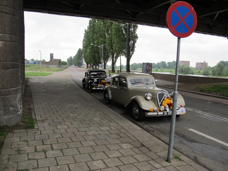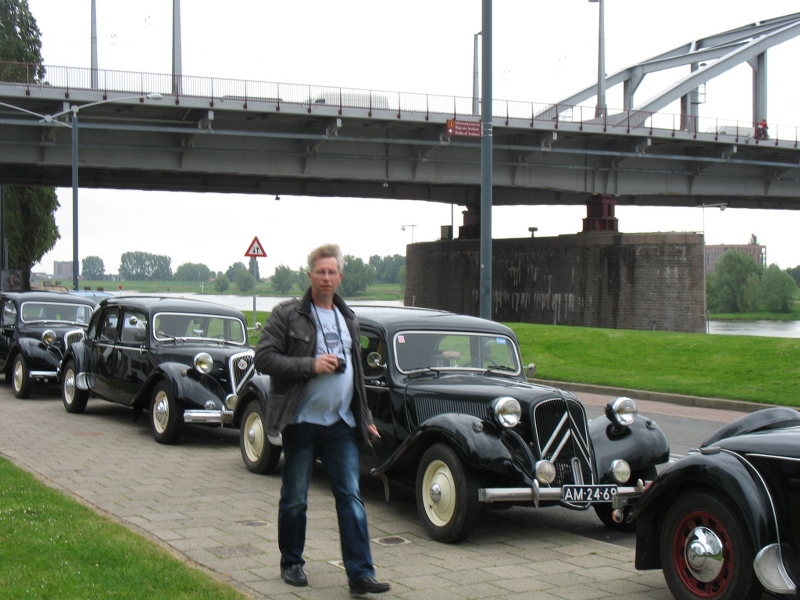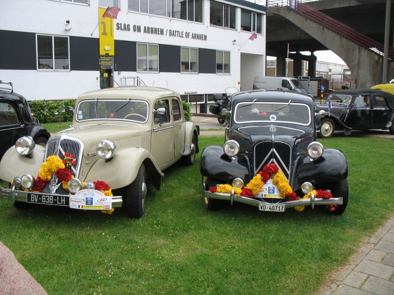Arnhem verschenen we met 4 tractions, grote verrassing alleen Ronald wist ervan. Samen een glas wijn geheven en buiten de auto's bekeken, daarna moesten ze nog aan het dessert (Franse tijden!). Donderdag morgen - na wederom verzameld te hebben bij Tom de Haan reden er maar liefst 7 Gelre tractions naar het Market Garden info centrum net onder de John Frostbrug in Arnhem. Om 10.00 h zou een Arnhemse wethouder onze buitenlandse vrienden welkom heten, belangrijke personen zijn altijd te laat dat werd 10.30 h dus. Daarna ging de stoet van 11 tractions over de Rijnbrug , via de oude Rijksweg > Elst > naar de Waalbrug Nijmegen. De echte route van de geallieerden dus, (Herman Lelivelt was wederom de gids) vervolgens naar de landingsterreinen rondom Groesbeek > toen werd de brug bij Grave nog "ingenomen" en werd er bij CAS te Zeeland een koffie-stop gemaakt - maar het was inmiddels al ver in de middag! Hier namen we afscheid, de 4 tractions hadden Waterloo in Belgie als einddoel die dag.