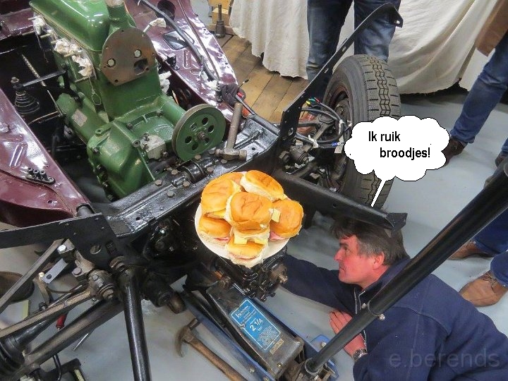 Op zaterdag 23 april hadden we sleutel”morgen” in de garage van Henk Hanenburg te Elst, adres kon niet missen gezien het enorme spandoek en de tractions op de oprit! Binnen stond de steeds mooie wordende nog in opbouw zijnde décapotable van Dick Appels, door Joop Tijssen effe getransporteerd en wat later volgde de motor dankzij Theo Schrijvers. Bedankt mannen!