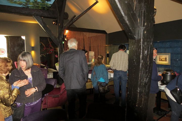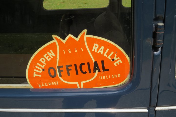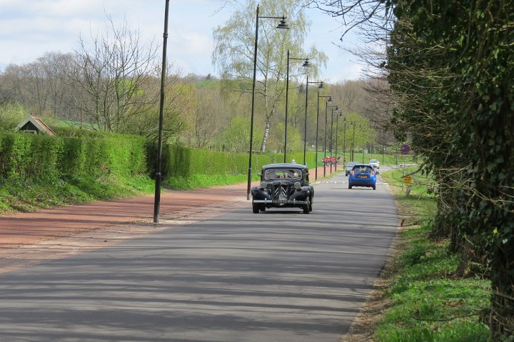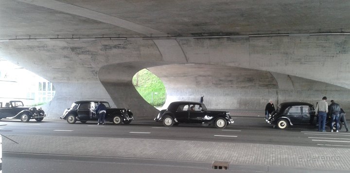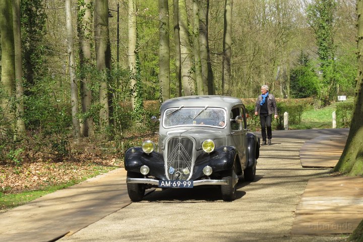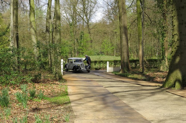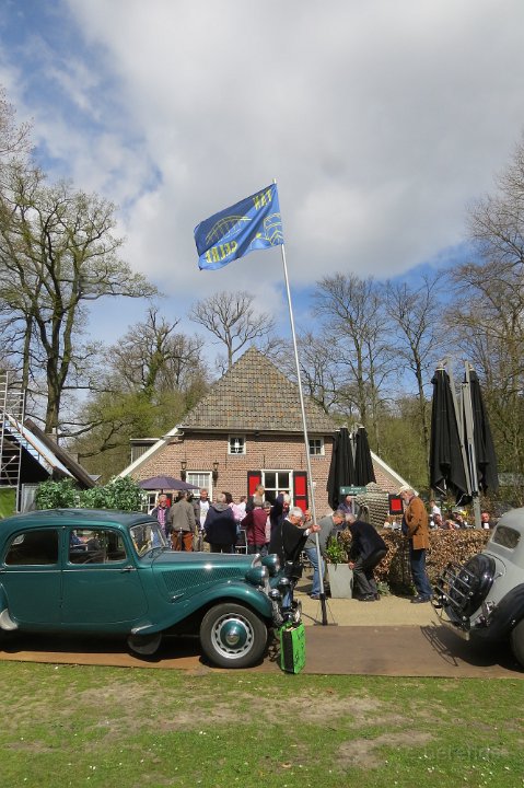 Al voor 11.30 stonden er al diverse tractions op de rijplaten voor De Boerderij aan de rand van park Sonsbeek in Arnhem. Hier vond dus exact 40 jaar geleden de oprichting van de toenmalige afd Arnhem plaats. Bij ons 25 jarige bestaan zijn we Gelre gaan heten, die vlag dekte de lading beter. Omdat er verbouwd werd bij De Boerderij lagen er rijplaten op het gazon aan weerszijden van voet/fietspad ervoor, dat was ons geluk want de tractions mochten daarop parkeren! Uiteindelijk 23 stuks een prachtig gezicht. Een fietser kwam met de melding dat er tractions stonden onder Zypse viaduct, waarvan één met pech! Toonde ons als bewijs een plaatje op zijn mobieltje, maar gelukkig kwam deze stoet even later compleet aanrijden. De Gelre vlag werd uiteraard gehesen aan onze mobiele vlaggenmast. Om 12.30 h opende het overheerlijke buffet dat binnen klaar stond voor de 44 inschrijvers, buiten in de zon dit dus gezellig verorberd, zo nu en dan weer wat bijhalen binnen, daarbij steeds even wennen aan de overgang van licht naar donker! Veel belangstelling van de vele voorbijgangers in het zon overgoten park. In de vijver tegenover De Boerderij ligt een drijvend podium, dat bleek mede ontworpen te zijn door Henk van der Krabben, een ex Gelre-lid die al weer jaren in Frankrijk woont en daar behalve een traction en een HY, vele eenden en diverse Peugeots heeft. Verhuurt gîtes, Solexen, van alles te beleven daar i n de Alliers, zie www.lalue.eu
