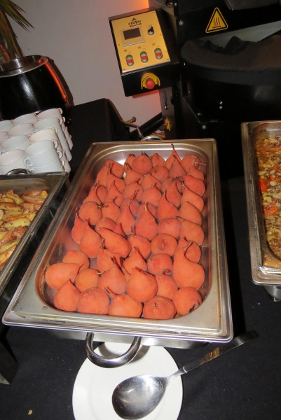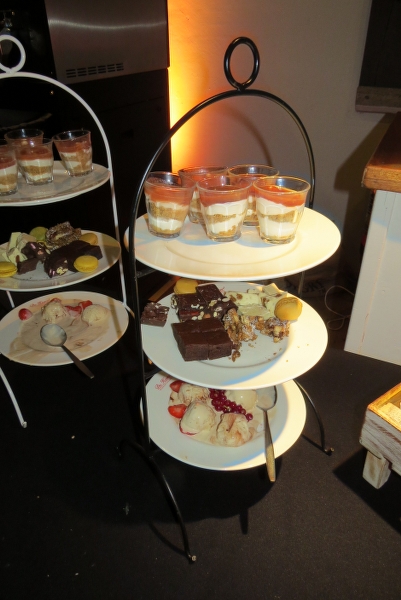 Genoten van de diverse gerechten; na de pompoensoep met brood en salades de keuze uit oa diverse vis - en vlees-gerechten, rode kool, stoofpeertjes, coq-au -vin, met als dessert zg etagères met allerlei lekkers!