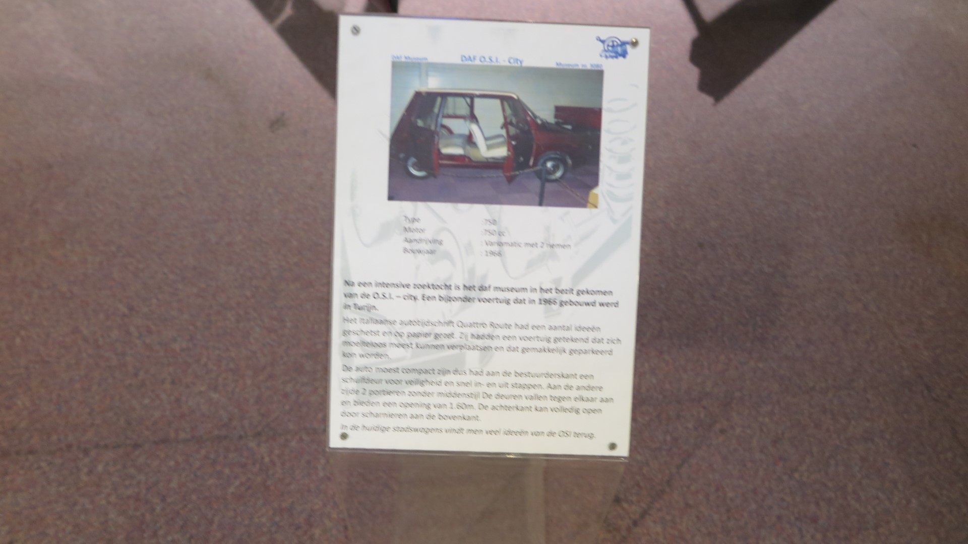 Er staan redelijk wat prototypes in het museum die nooit in productie zijn genomen omdat men het financiële risico te groot vond. Wel veel vrachtauto's en gebruiksvoertuigen van DAF voor de Nederlandse krijgsmacht, politie, brandweer, vuilnisophaaldienst, PTT, transport, bussen, en de DAF van Jan De Rooy die er Parijs-Dakar mee heeft gereden