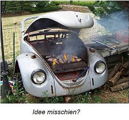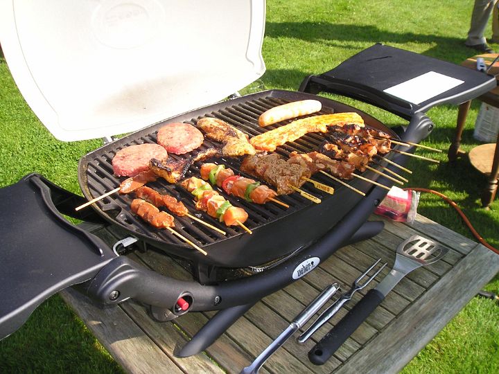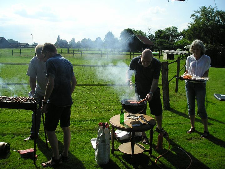 Uiteindelijk 20 volwassenen en 3 kinderen in de tuin, diverse tafels, parasols en inderdaad een dubbele Weber ( met wat startproblemen) Met vereende krachten van de superstokers werden de BBQ warm gestookt. In de keuken stond een enorme schaal met vers aangemaakte salade, diverse vleessalades, groente, stokbrood, drank - alles prima verzorgd door Theo en Maria. Zelfs frietjes voor de kinderen.