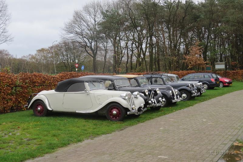 Zondag 15 november, na een zeer zachte week ineens echt herfst met regen en wind! Toch verschenen er naast het moderne blik toch 10 tractions en een DS op de P-plaats van cafe 't Uuleke in Ewijk. Bij de meeste zat het fraaie Gelre schildje al op de grille gemonteerd! Tegen 11.30 h zaten er ruim 40 personen aan de koffie met gebak! Welkomst woord van Heiko, verheugd weer wat oude bekenden te zien en uiteraard waren we even een minuut stil vanwege het drama in Parijs...