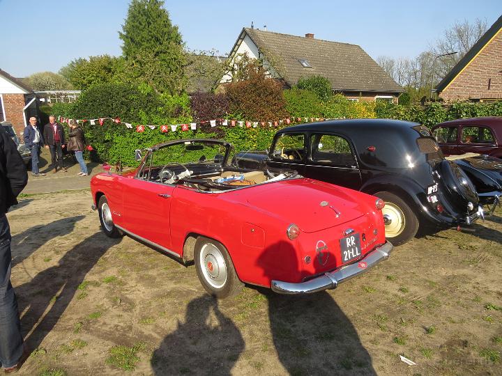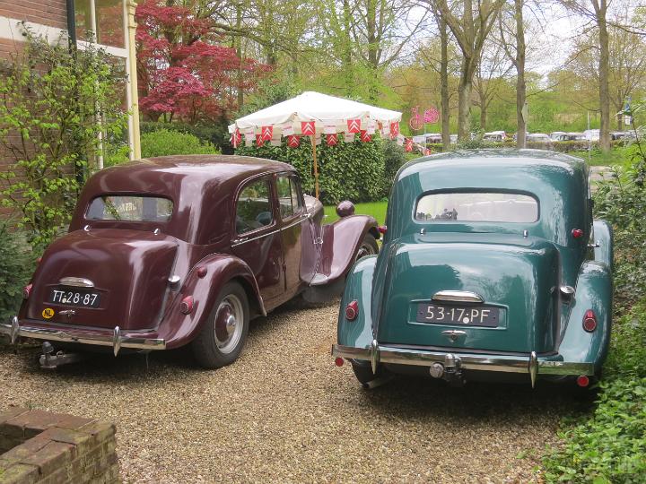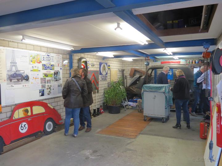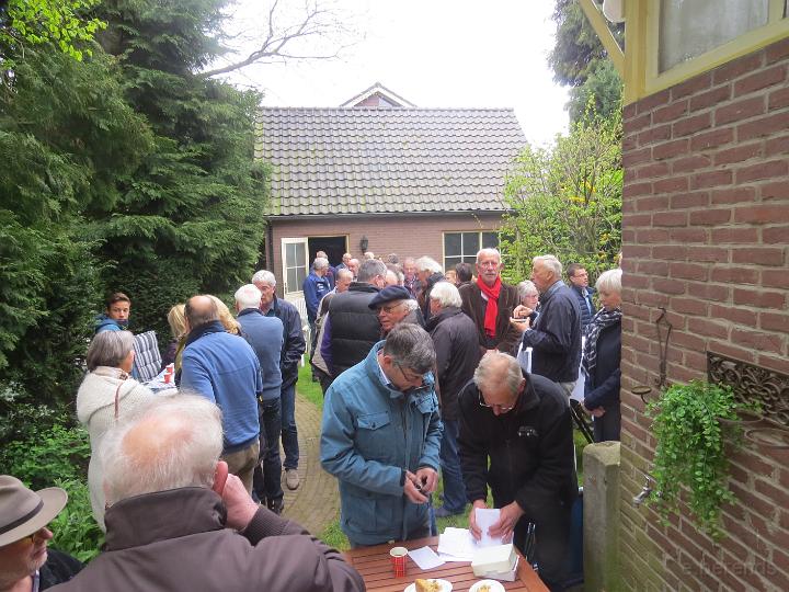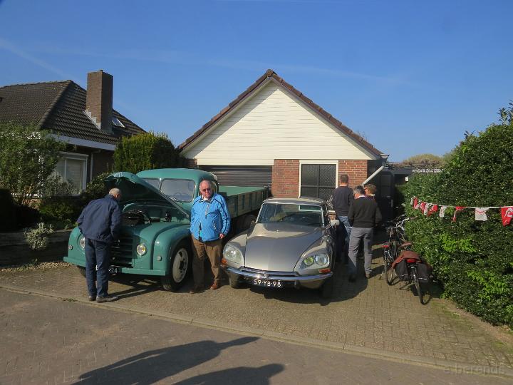 Koffie met gebak bij Hennie & Bert in de achter-tuin, een heus museum in de serre! Jammer om er na 12.00 h al weer weg te gaan. Prachtige rit door landelijke omgeving met het ontluikende groen. Lange lunch /pannenkoeken-stop bij Erve Kots. (We hielden alles binnen!) Even WW-hulp - was toevallig daar aanwezig - voor Heerko (1 stoterstang losgeschoten!) Toen tweede deel naar Rheden met ook daar weer fantastische ontvangst met allerlei lekkernijen in de achtertuin van Joop & Bets! De keurig nette garage bekeken. DS net gereed, Engelse Slough traction volgende project? Zit nog een 2CV tussen hoorde ik! Bert/Hennie + Joop/Bets bedankt voor deze superdag!