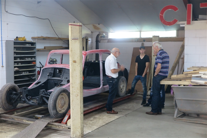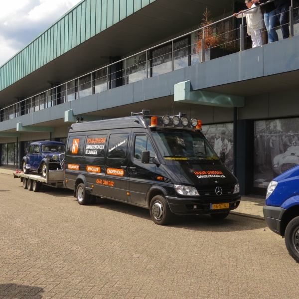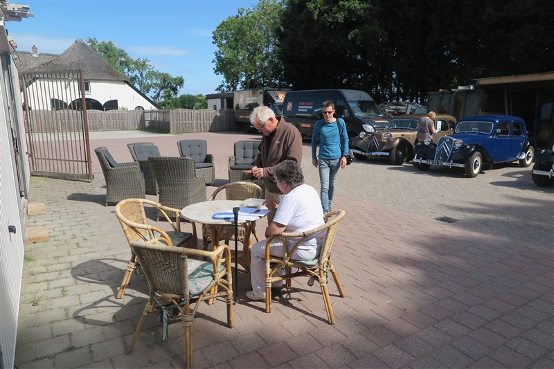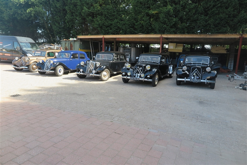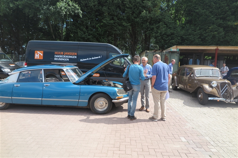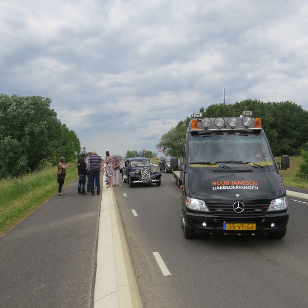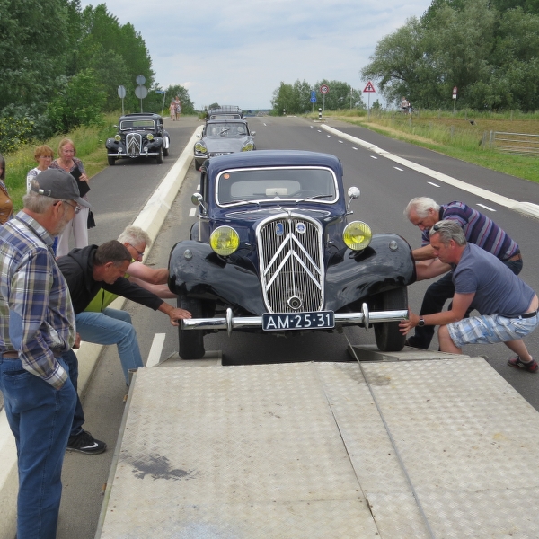 Toen van start voor leuke rit door het land van Maas en Waal waarbij beide rivieren daadwerkelijk in zicht kwamen. In Beneden Leeuwen was keurig plek gereserveerd om te lunchen, grenzend aan het dorpsplein dus met de tractions mooi in zicht. Daarna helaas pech voor Herman & Yvonne, rechtsaf de Waaldijk oprijden stond er in de routebeschrijving. Zo gezegd zo gedaan, helaas iets te letterlijk want ze kwamen op het brede fietspad terecht gescheiden met de rijbaan door een beton-richel. Toen Herman er over heen reed bleek die zo hoog te zijn dat dat traction er op vast kwam te staan en het stuurhuis afgebroken bleek te zijin. Met vereende krachten de auto op de rijbaan geduwd, snel Huub gebeld en die was supersnel ter plaatse met een auto-ambulance. Wat een service! Heb je net probleemloos de Hemelvaartrit gereden en dan dit! Traction er snel opgelierd en naar het eindpunt Druten - 5 min verderop Daar stond de rest al bij het Automuseum Metropole. De enorme privé-collectie van Frans van Haren bekeken die ons zelf rondleidde. Bugatti’s, Ferrari’s, Mercedessen Flügeltür en een unieke Tatra 12 cilinder. Vol trots toonde hij ons ook de 4 Citroëns, nog geen traction erbij trouwens! Daarna in het museum café gezellig napraten waarna we genoten van een heerlijk buffet! een zeer geslaagde dag, jammer van die pech!