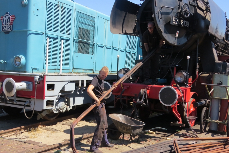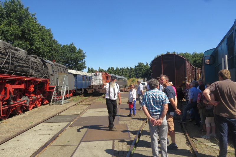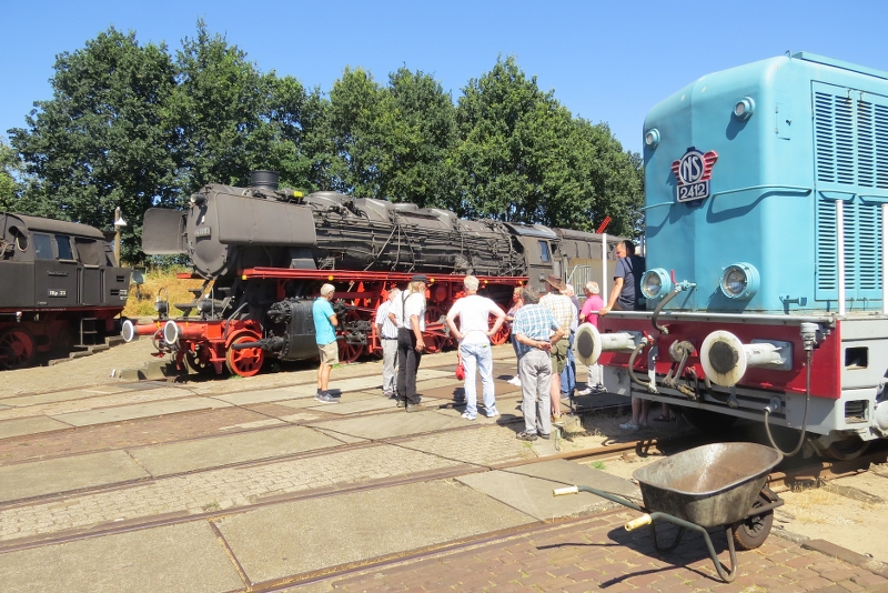 13.00 h - mooie route over vaak wat stoffige wegen naar Beekbergen/Lieren. Ontvangst en rondleiding bij Veluwse Stoomtrein Maatschappij. Kunnen wat tractions het terrein op, blijkt het maar en nietig voertuig te zijn naast die enorme stoomlocs! Allemaal iets lomper en zwaarder dan bij onze hobby... maar zeker niet minder interessant, ook niet vies van zwarte handen - en de rest - hier! Alles draait de (zwarte) handjes van vrijwilligers hier, ook sierlijke vrouwlijke zien we!