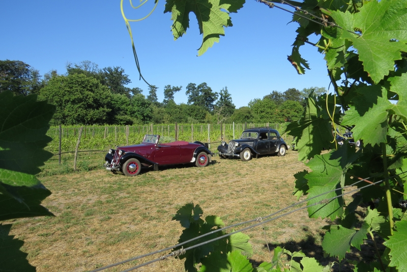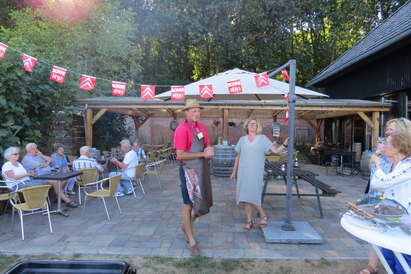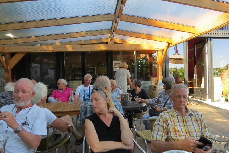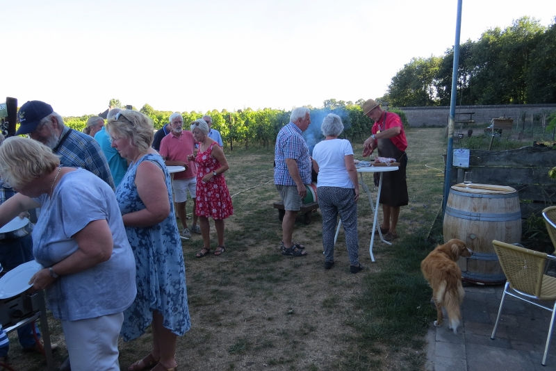 Na kort vervolg ritje tegen 17.00 h ontvangst op fraaie geheel ommuurde wijngaard Domein Hof te Dieren. De trossen hangen er al mooi bij, eerst proeverij van 3 soorten - daarna werd het vuur ontstoken tbv BBQ. Vele soorten vlees, lekkere salades, muziekje erbij, gezellig bijpraten, wijntje uiteraard en koffie na, Prachtige avond na een zeer geslaagde dag!