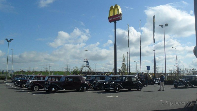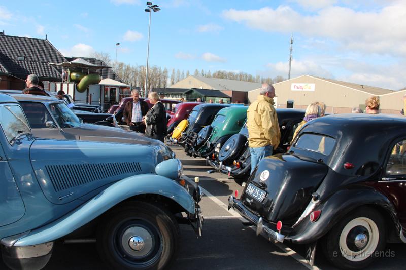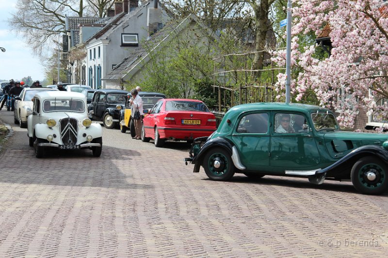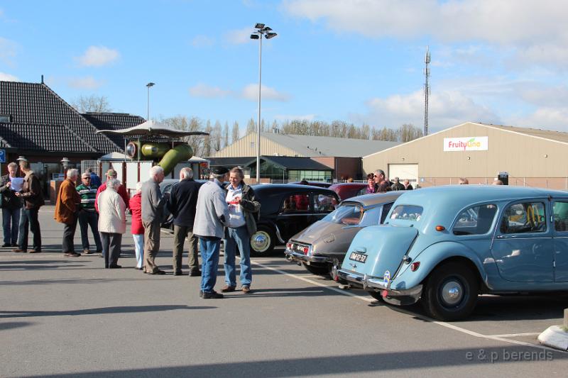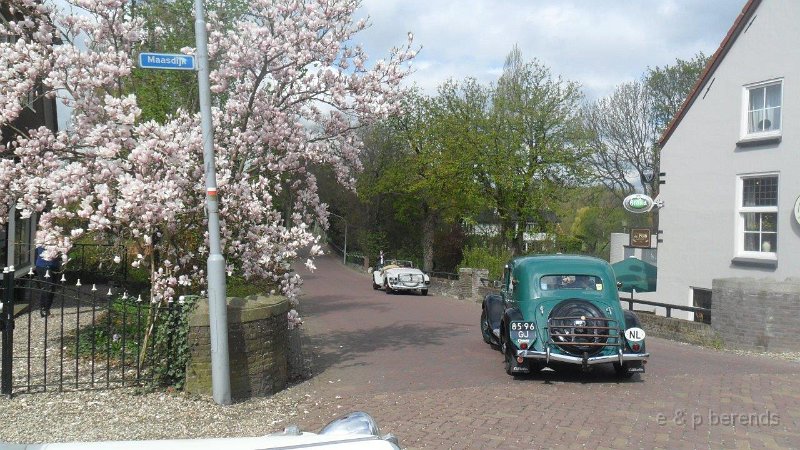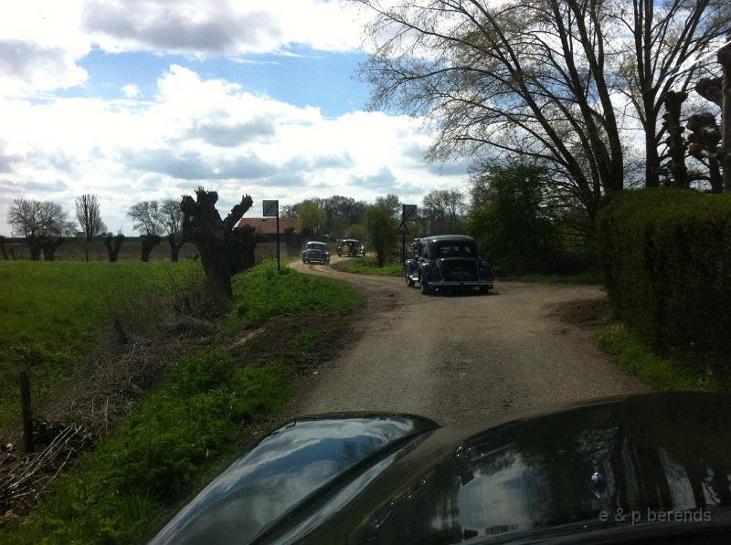 Zondagmorgen 28 april, zowaar lentezon op de P-plaats bij Mac Donalds in Ochten, uiteindelijk hadden er zich ca 25 equipes aangemeld voor de gezamenlijke VJ rit van Gelre & Midden. Behalve vele (kleurige) tractions ook één fraaie oude R4 en een zwart-wit DS duo! Snel weg van de snelweg en rustig toeren over Maas - en Waaldijken , door nog slaperige oude dorpjes en stadjes, vele fraaie panden en kasteeltjes langs de route. Onze belofte was waargemaakt overal volop bloesem! Op een flink stuk onverharde weg moesten de fietsers even plaats maken, sorry.....