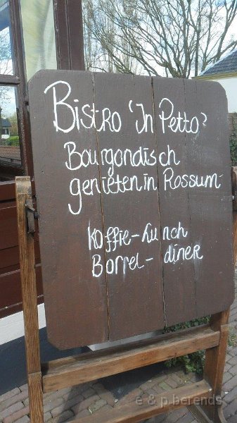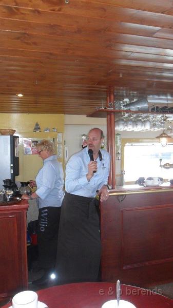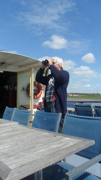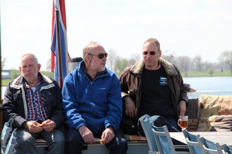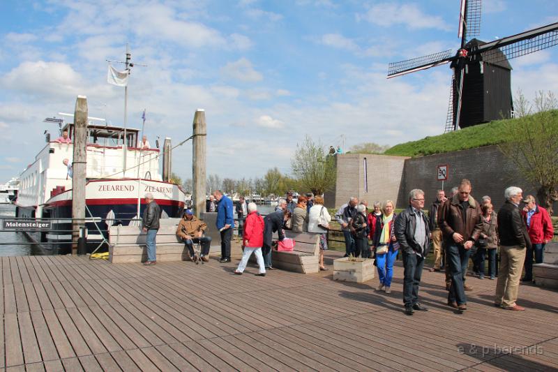 In Rossum werd bistro In Petto met een bezoek vereerd, Bourgondisch genieten stond er op het schoolbord. Er kon zowaar buiten gezeten worden, alleen even verstoord door de blauwe twee-takt dampen afkomstig van passerende oude nozems op prachtige Kreidlers en Zundapps! De rit werd vervolgd en tegen 13.00 h stond het hele wagenpark veilig (achter de hekken) geparkeerd van de scheepswerf te Heusden, keurig geregeld! Korte wandeling langs de stadswal met molens naar de aanlegsteiger van Wiljo. Daar gingen we aan boord van de Zeearend (uit 1954) om een mooie rondvaart te maken over Maas met uitleg over het geen we zagen. Koffie, thee, melk en lekkere broodjes werden ruimschoots geserveerd. Aan dek uit de wind en in het zonnetje was het heerlijk toeven! Genoeg te zien, veel pleziervaart en oude schepen op het water, mooie huizen langs de wal. Het eerste vee stond ook al in de wei of was aan het pootje baden!