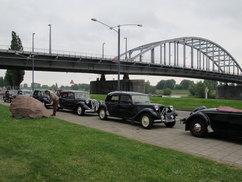 Arnhem verschenen we met 4 tractions, grote verrassing alleen Ronald wist ervan. Samen een glas wijn geheven en buiten de auto's bekeken, daarna moesten ze nog aan het dessert (Franse tijden!). Donderdag morgen - na wederom verzameld te hebben bij Tom de Haan reden er maar liefst 7 Gelre tractions naar het Market Garden info centrum net onder de John Frostbrug in Arnhem. Om 10.00 h zou een Arnhemse wethouder onze buitenlandse vrienden welkom heten, belangrijke personen zijn altijd te laat dat werd 10.30 h dus. Daarna ging de stoet van 11 tractions over de Rijnbrug , via de oude Rijksweg > Elst > naar de Waalbrug Nijmegen. De echte route van de geallieerden dus, (Herman Lelivelt was wederom de gids) vervolgens naar de landingsterreinen rondom Groesbeek > toen werd de brug bij Grave nog "ingenomen" en werd er bij CAS te Zeeland een koffie-stop gemaakt - maar het was inmiddels al ver in de middag! Hier namen we afscheid, de 4 tractions hadden Waterloo in Belgie als einddoel die dag.