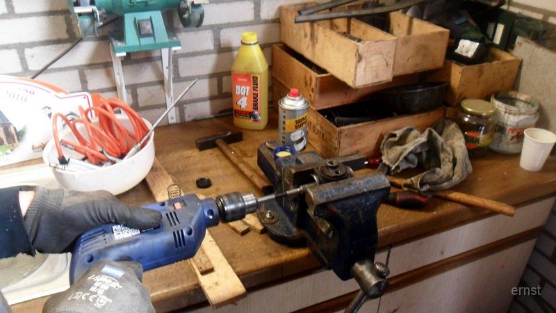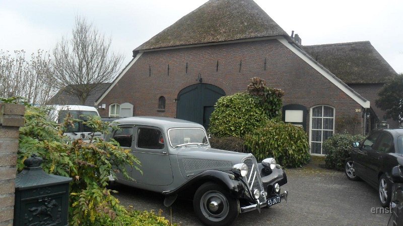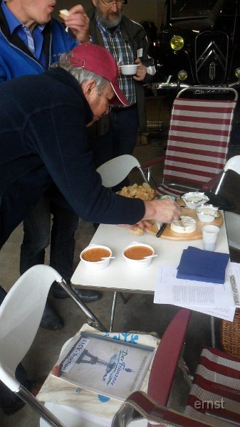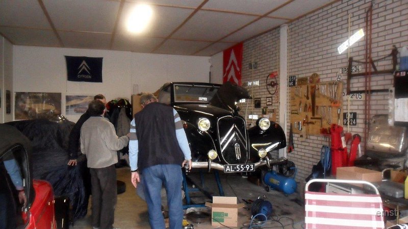 Al rond tienen bedrijvigheid aan de Klapstraat 26 in Elden, schuin tegenover onze afd. avond locatie De Kastelein waar we die avond ervoor nog geweest waren. Toen ruim 30 aandachtige toehoorders/sters voor Dick's Appels interessante verhaal over auto's op brandstofcellen. Tom had de Citroenvlag gehesen, dat kon dus niet missen en al snel stond het erf vol met voitures van allerlei makelij, alhoewel de Franse toch ruim overheersten! Binnen was er koffie met cake en stond Tom's traction op de hefbrug (een hele handige compacte trouwens!) Verder nog een snoek onder een hoes en een 2CV-cabrio met Hoffmann - carrosserie. Herman demonstreerde de aanwezigen hoe de voor-remtrommel eraf ging mbv ons speciale gereedschap. Er was zelfs een belangstellend lid van afd Rotterdam, die ook net met de remmen aan de gang wilde. Remzuigertje bleken muurvast in de remcilinders te zitten, we kregen dus ook een demo hoe zoiets opgelost dient te worden: met beleid eruit persen > zuigertjes op staalborstel schoonmaken, cilindertjes honen en dan uiteraard weer monteren met nieuwe cupjes en remvet. Het gesleutel werd onderbroken toen Anke de lunch de garage binnenbracht, overheerlijke zeer rijk gevulde soep, stokbrood met diverse kazen met daarbij een lekker Frans wijntje. We kwamen helaas een remcupje te kort om het karwei voor af te maken. Goede opkomst met 14 leden, na Tom & Anke met een lekkere fles Merlot bedankt te hebben voor de gastvrijheid en de lunch ging een ieder voldaan weer huiswaarts. Totaal 14 leden, een goede opkomst dus. Eerstvolgende Gelre evenement is de VJ rit samen met Midden, denken in totaal gezamenlijk zo'n 30 Tractions in beweging te krijgen op zondag 28 april. Er kan nog ingeschreven worden!