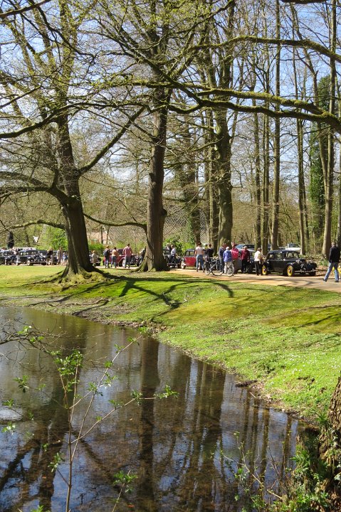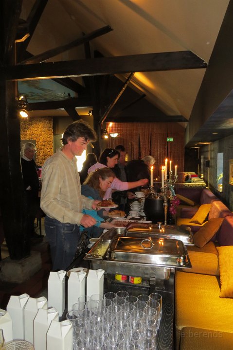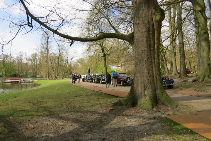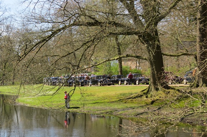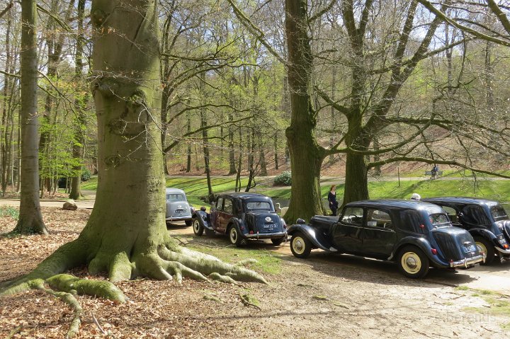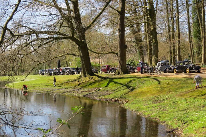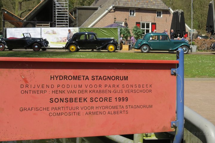 Al voor 11.30 stonden er al diverse tractions op de rijplaten voor De Boerderij aan de rand van park Sonsbeek in Arnhem. Hier vond dus exact 40 jaar geleden de oprichting van de toenmalige afd Arnhem plaats. Bij ons 25 jarige bestaan zijn we Gelre gaan heten, die vlag dekte de lading beter. Omdat er verbouwd werd bij De Boerderij lagen er rijplaten op het gazon aan weerszijden van voet/fietspad ervoor, dat was ons geluk want de tractions mochten daarop parkeren! Uiteindelijk 23 stuks een prachtig gezicht. Een fietser kwam met de melding dat er tractions stonden onder Zypse viaduct, waarvan één met pech! Toonde ons als bewijs een plaatje op zijn mobieltje, maar gelukkig kwam deze stoet even later compleet aanrijden. De Gelre vlag werd uiteraard gehesen aan onze mobiele vlaggenmast. Om 12.30 h opende het overheerlijke buffet dat binnen klaar stond voor de 44 inschrijvers, buiten in de zon dit dus gezellig verorberd, zo nu en dan weer wat bijhalen binnen, daarbij steeds even wennen aan de overgang van licht naar donker! Veel belangstelling van de vele voorbijgangers in het zon overgoten park. In de vijver tegenover De Boerderij ligt een drijvend podium, dat bleek mede ontworpen te zijn door Henk van der Krabben, een ex Gelre-lid die al weer jaren in Frankrijk woont en daar behalve een traction en een HY, vele eenden en diverse Peugeots heeft. Verhuurt gîtes, Solexen, van alles te beleven daar i n de Alliers, zie www.lalue.eu