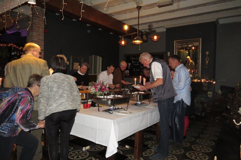 Al voor 18.30 h liep het knusse zaaltje lekker vol, eerst met het welkomstdrankje een uurtje gezellig bijpraten om daarna aan te zitten aan maar liefst 3 heerlijke buffeten: voor -, hoofd - en als het er nog bij kon een dessertgerecht met koffie na! We bleken zowaar ook nog een jarige in ons midden te hebben die NB zijn eigen feestje een dag verzet had om aan dit diner deel te kunnen nemen! Uiteraard werd er voor hem gezongen! Proficiat Bert Zantinge! De traditionele Mutsenfoto bij de kerstboom voor de Bestuurs Kerst & NJ groet werd gemaakt van het bijna voltallige bestuur. Om 23.30 h verliet als laatste de penningmeester – na het betalen, dus zonder af te wassen - het pand! Zeer geslaagde avond!