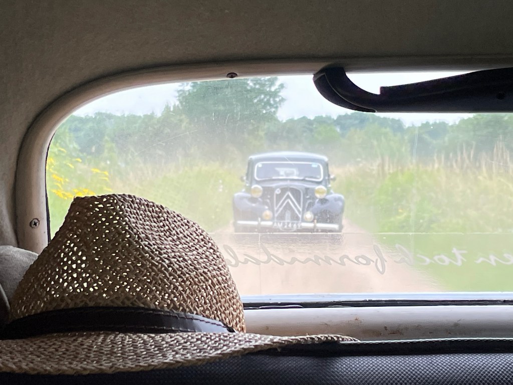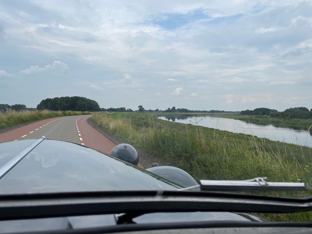 Desalniettemin hadden we 27 dagjesmensen, waarvan een deel rond half 2 arriveerde. Het was goed toeven op het terras en, hoewel het niet gepland was, werden daar zelfs drankjes en appelgebak geserveerd, zodat we wat later vertrokken. Dat de rit was uitgezet door Huub en avonturier Michel bleek als snel toen we de verharde weg verlieten en in de binnenspiegel Dakar-achtige toestanden waarnamen. Het voordeel van voorop rijden is dat je dan geen stof hoeft te happen. We reden door de mooie onverpeste Brabantse natuur, 2x langs kasteel Tongelaar en kwamen in het bos zelfs 2x een olifant tegen in de Bibendum variant van Michelin. De weg werd vervolgd door leuke plaatsjes en over de dijk langs de Maas, waar we ons in Ravestein door een smalle poort moesten wurmen. Het is eenieder gelukt om de spatborden in takt te houden. Ook hier werd de wielophanging en de carrosserie weer uitgebreid getest, ditmaal op de kasseien. Voor zover ons bekend is niemand onderdelen verloren.
