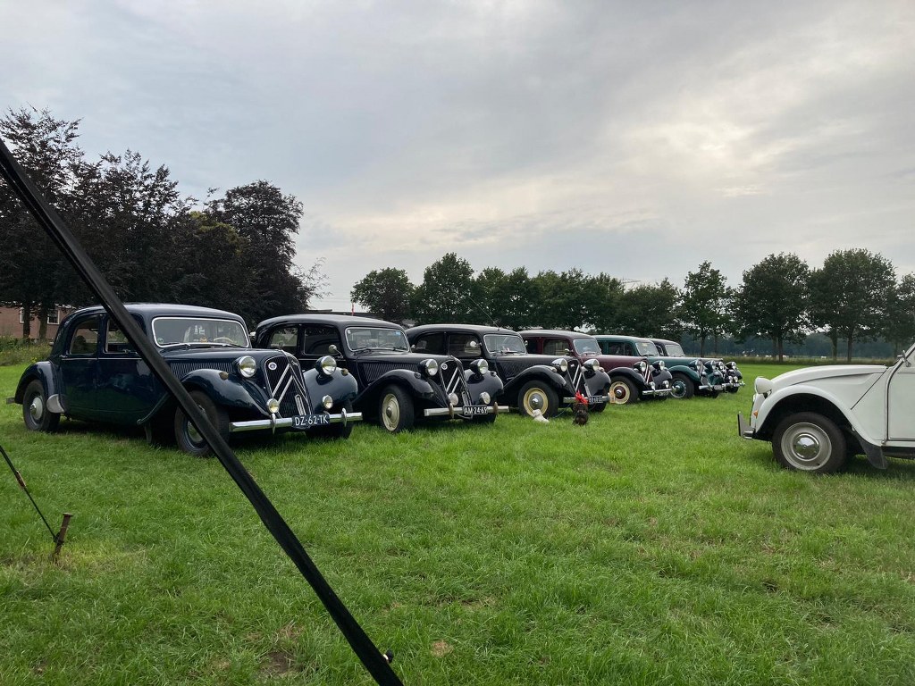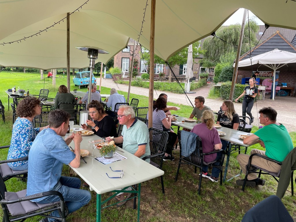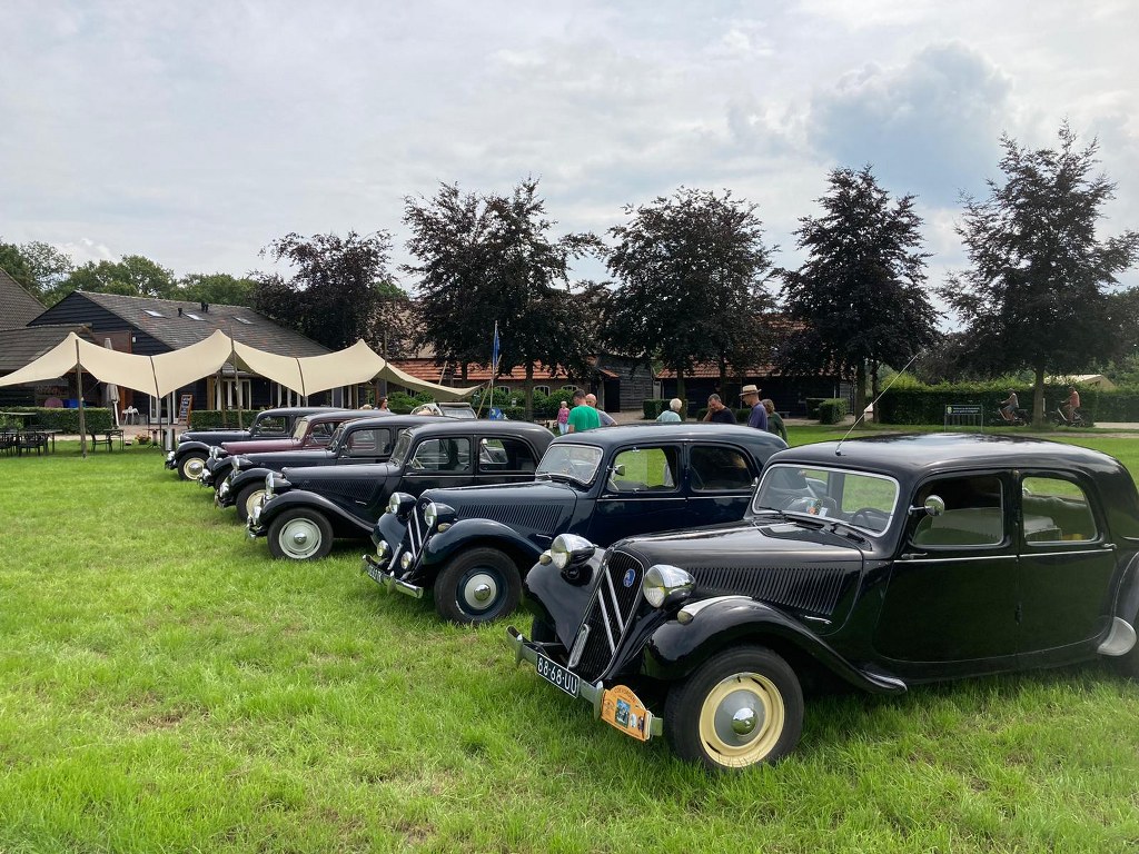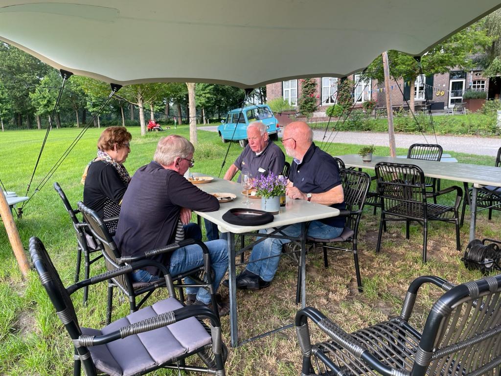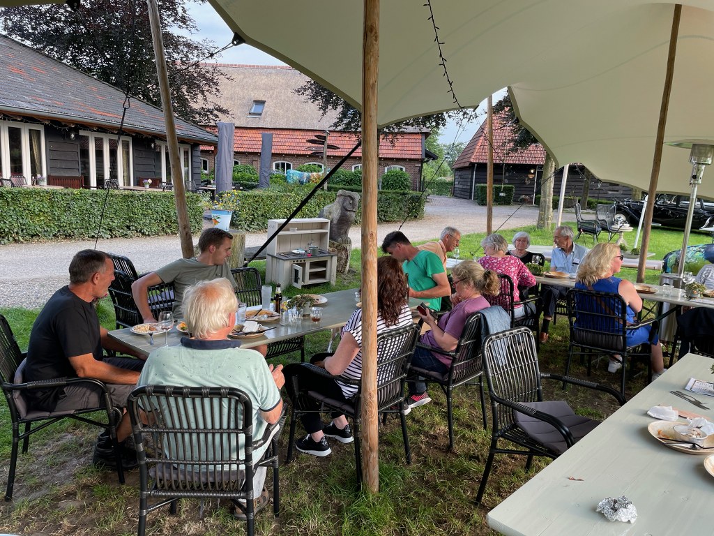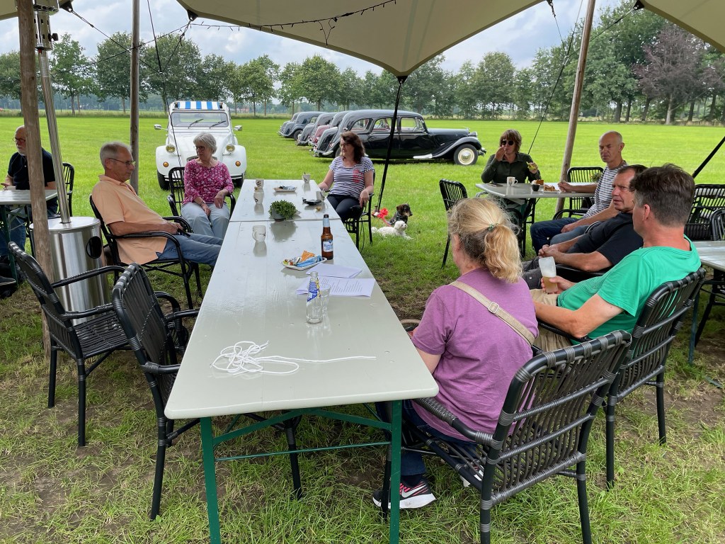 Rond 16:30 arriveerden we weer op de Barendonk, waar al een aantal avondgasten in de zon op het terras aan de borrel zat. Benno had spijt dat hij niet met de Traction gekomen was, want zijn ID had zo haar eigen ideeën over de geplande aankomsttijd waardoor hij de rit gemist had. Om 17:30 kwamen de eerste lekkernijen van de BBQ. Binnen stonden lekkere salades en sauzen, iedereen kwam goed aan zijn trekken. Onder de grote partytent was uitgebreid gelegenheid met elkaar weer eens lekker bij te praten met zicht op de Tractions. Joop Z opperde om bij naderende regen de Tractions onder de tent te zetten, maar dit bleek niet nodig want de voorspelde hoosbui ging geheel aan ons voorbij. Tijdens het eten speelde de fam. Janssen de Marseilleise via de smartphone en zong Joop T, inmiddels voorzien van alpinopet, luidkeels mee. Voldaan keerden de meesten weer huiswaarts.