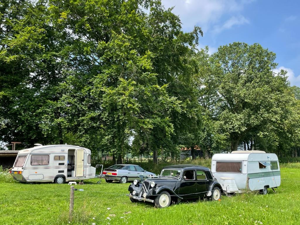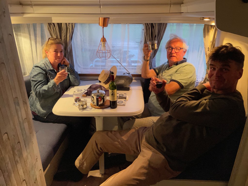 De kampeerders dronken in de caravan nog een stukje van Michel’s wijnvoorraad op en Joop T schoof gezellig aan. Na dit slaapmutsje volgde een stille nacht en een ontwaken midden in de natuur, waar alleen vogelgeluiden te horen waren. En dat in het hoogseizoen op een camping die vol staat. Daar hebben wij niets van gemerkt. Wederom waren de weergoden ons gunstig gezind en na een ontbijt buiten met verse boerder-eieren en Barendonk–kaas maakten we een mooie wandeling door het bos. De mist was snel opgetrokken en de zon scheen volop. Terug op de camping hadden we ontdekt dat in het uutbloashuuske op 20 meter van de caravan een zelfbedieningskiosk was met verse appeltaart. Die zorgde voor een mooie afsluiting van het kampeerweekend, waarna in de middag onze hutten weer achter de Citroën meegesleurd werden naar huis.
