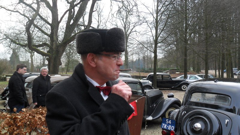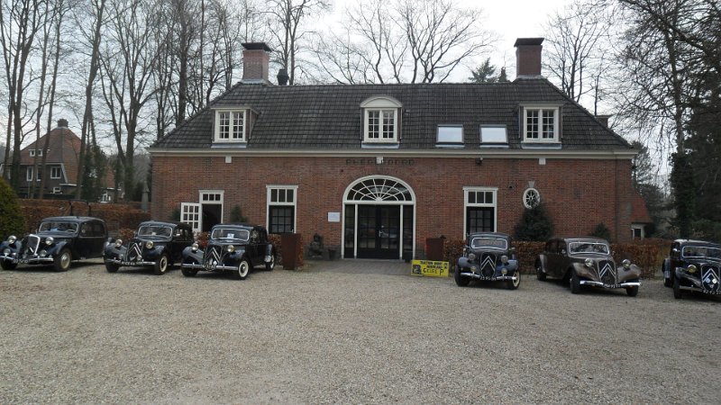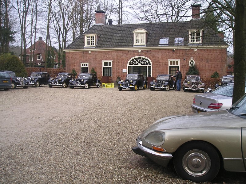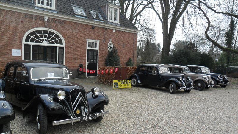 Al voor 14.00 h reden de eerste Tractions de statige oprijaan op. Het droge licht vriezende weer weerhield 10 Gelre leden er niet van om te tracs thuis te laten. Binnen in het Koetshuis brandde de open haard en was het lekker warm en werd het steeds drukker. De 10 Tractions stonden keurig naast elkaar opgesteld voor het Koetshuis. De families Janssen en Tersluijsen - met 5 kinderen - kwamen in één superlange auto, neen geen Familiale maar een Lincoln Towncar van ruim 9 meter, met bar dus de receptie was onderweg al begonnen!