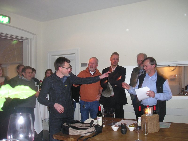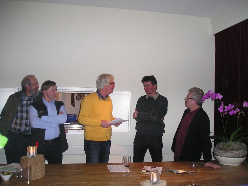 Zowel de oude als de nieuwe Pechvogel van het Jaar waren niet aanwezig, geen pech maar vanwege familieverplichting en deelname aan de Interclassic beurs. Benno Schmitz mag dit jaar de trofee poetsen, hij wilde zijn buurman demonstreren hoe goed de pas gerepareerde Big Six startte, hij deed dat staande naast de wagen via het open raampje. Inderdaad,starten en lopen - Herman had zijn werk goed gedaan - helaas stond de auto in zijn achteruit en niet op de handrem! Twee andere oldtimers werden geraakt, 3 auto's met schade dus! Verder werden uiteraard de web-site maker Frank, de TAN-kalender ontwerper Rob en redactie-lid Pim met een lekker flesje wijn bedankt voor hun verdiensten!