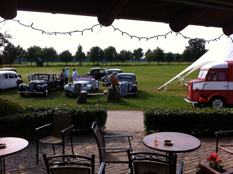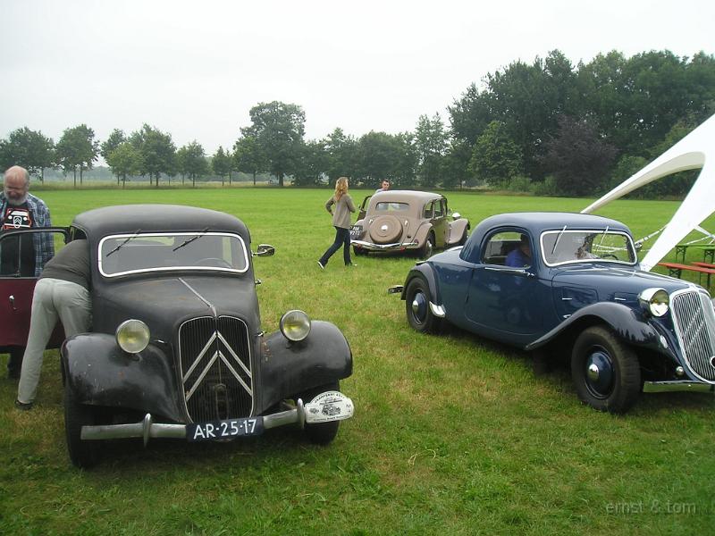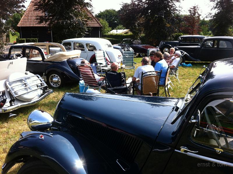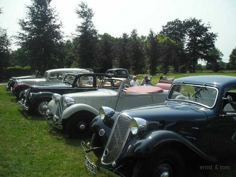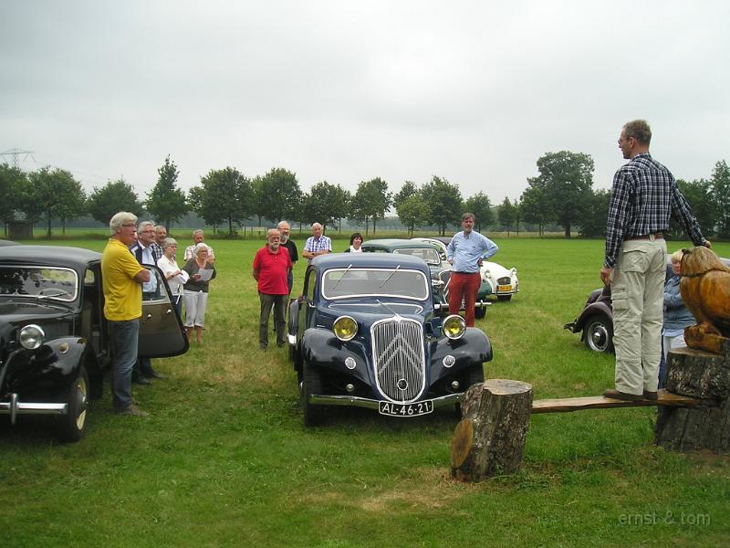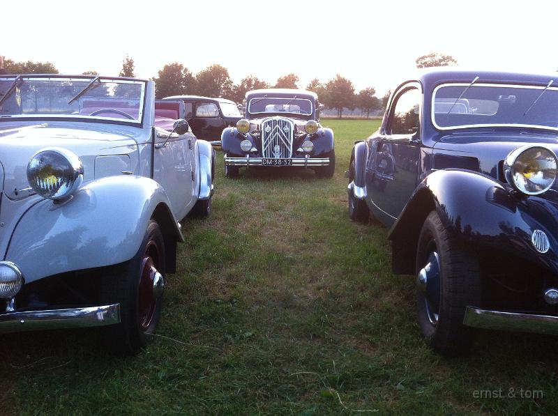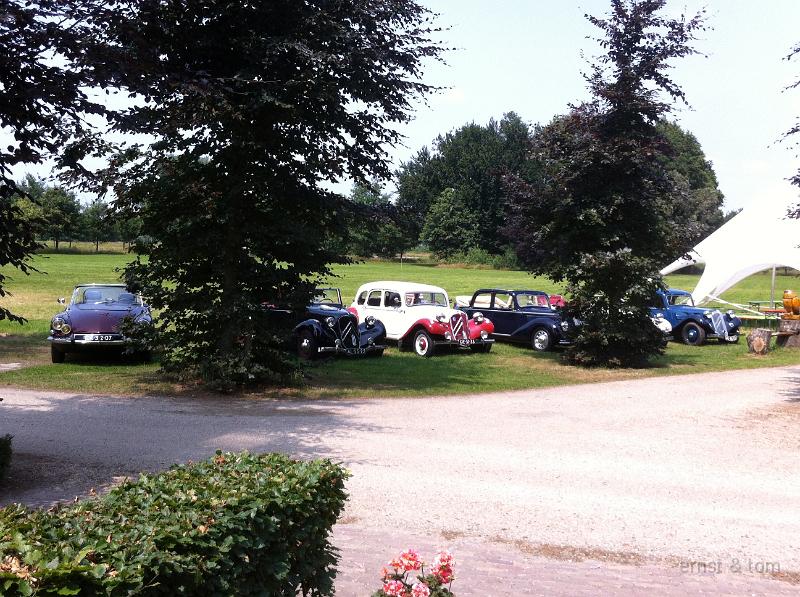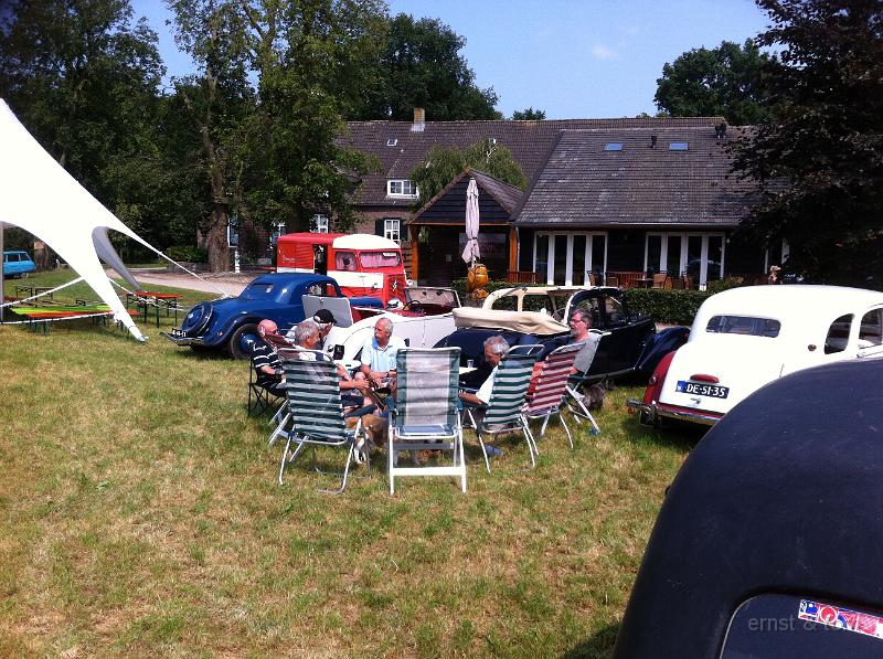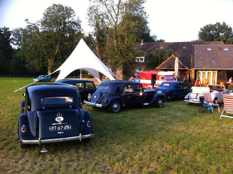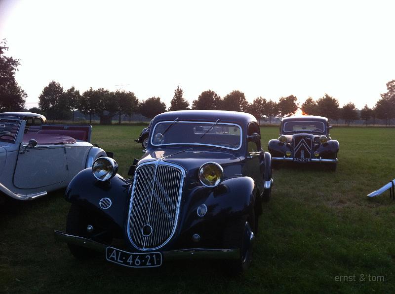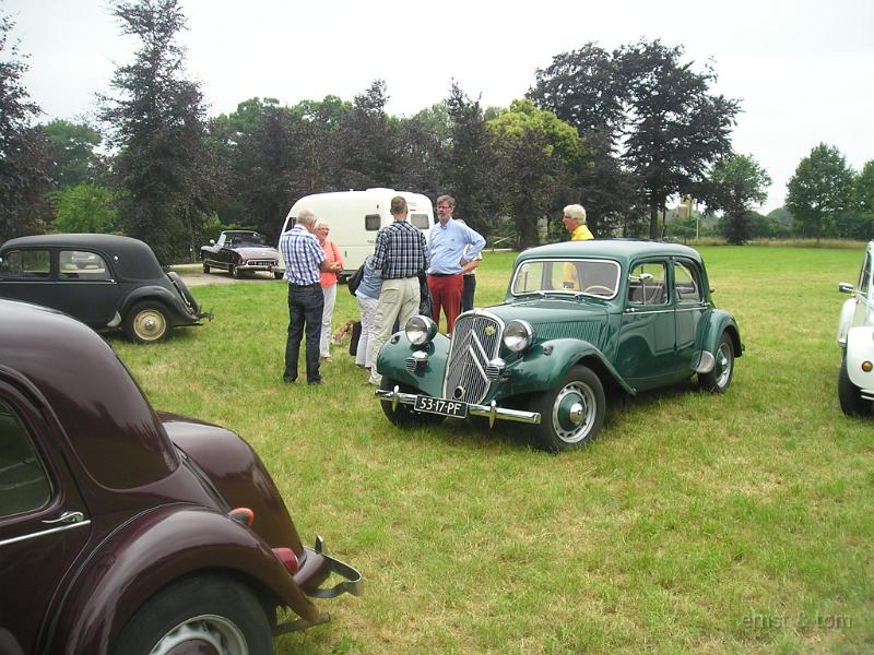 Hierna werd het kamp opgebroken en om 13.00 uur startte een internationale rit, waarbij conform de theory of constraints van managementgoeroe Goldratt de langzaamste auto voorop reed: Hans en Hanneke met daarachter de Kip Krielhen uit 1961. De sliert trok hiermee veel bekijks van omstanders. De rit voerde van Brabant naar Limburg, door Duitsland via Kleve en Emmerich naar Gelderland waar we via 's-Heerenberg de achterhoek in reden naar Hummelo. Hier was al 4 dagen een Fête Nationale aan de gang, waar wij als kers op de taart via een stoffig zandpad binnen reden en onze voitures opstelden naast Hotel/Restaurant de Gouden karper, die ons met een glaasje wijn verwelkomde. Meteen stonden er drommen mensen omheen die de berijders het hemd van het lijf vroegen. Gezien de tropische temperatuur die inmiddels was ontstaan was dat geen straf. Er stond ook een Peugeot 203 tussen onze Traxen en verderop een aantal 2CV's die ook te huur waren. In het dorp was een uitgebreide Brocante, overal klonk Franse muziek en in de plaatselijke kerk stond Bennie Jolink van Normaal schilderijen te beoordelen. Nog maar twee weken geleden was een klein groepje Gelre leden wezen høken in Toldiek, enkele kilometers verderop. Toen deze hierover vertelden bleek hier meer animo voor te zijn, dus als dat Normaal volgend jaar weer oerend hard optreedt zal de groep høkende Tractionrijders groter zijn. Diverse Gelre leden streken neer op een aangenaam terras en om 17.30 uur schoven we aan bij De Gouden Karper, waar een heerlijk Frans driegangen diner werd geserveerd met daarbij een drankje van het huis. Voldaan wilden we huiswaarts keren, maar Bert en Hennie Zantinge deden er nog een schepje bovenop door ons bij hen thuis uit te nodigen voor een kop koffie / thee met lekkere koek. De hele stoet trok dus van Hummelo naar Ellecom om daar nog een gezellig uurtje in de tuin door te brengen en het musée Quai de Javel te bekijken. De Trax van Tom klonk plotseling als een moderne C1 en had 25% vermogen minder. Uit een blik onder de motorkap bleek meteen dat er sprake was van sabotage, een lolbroek had een bougiekabel los getrokken zodat 1 cylinder geen medewerking verleende.