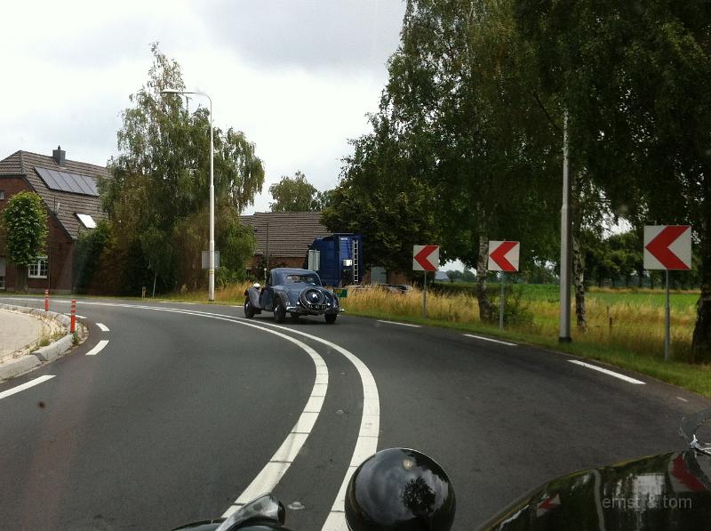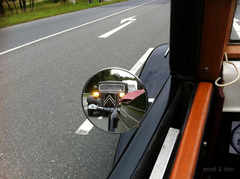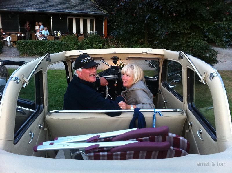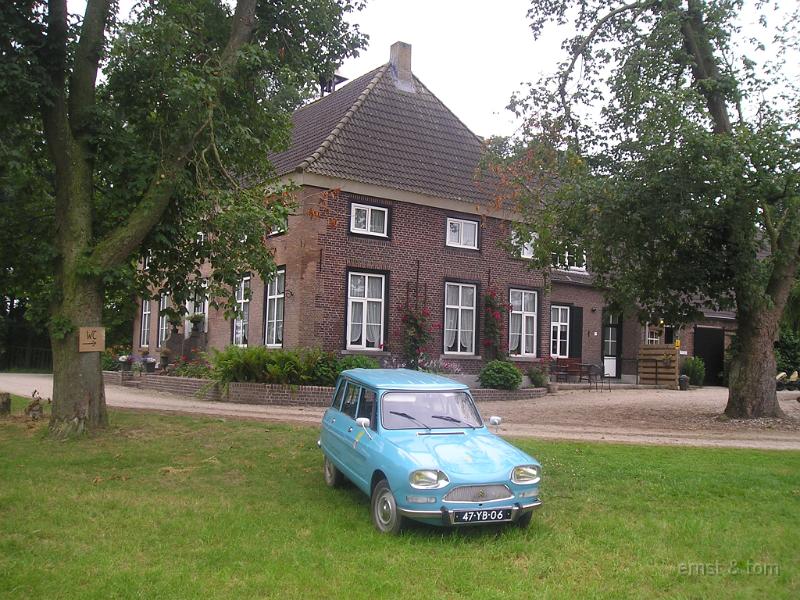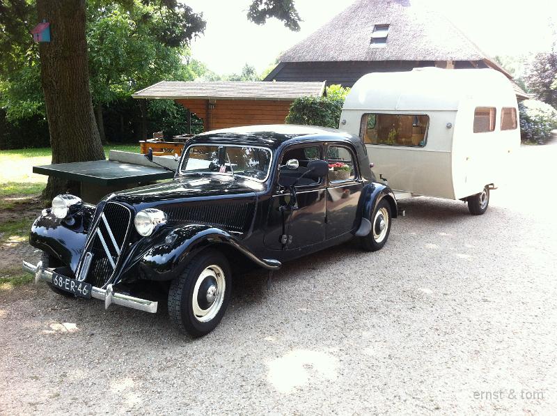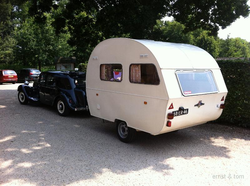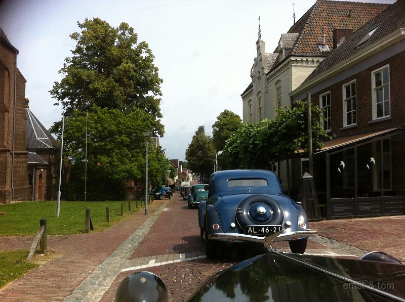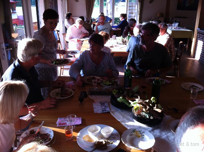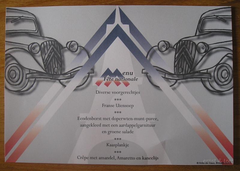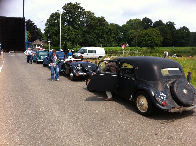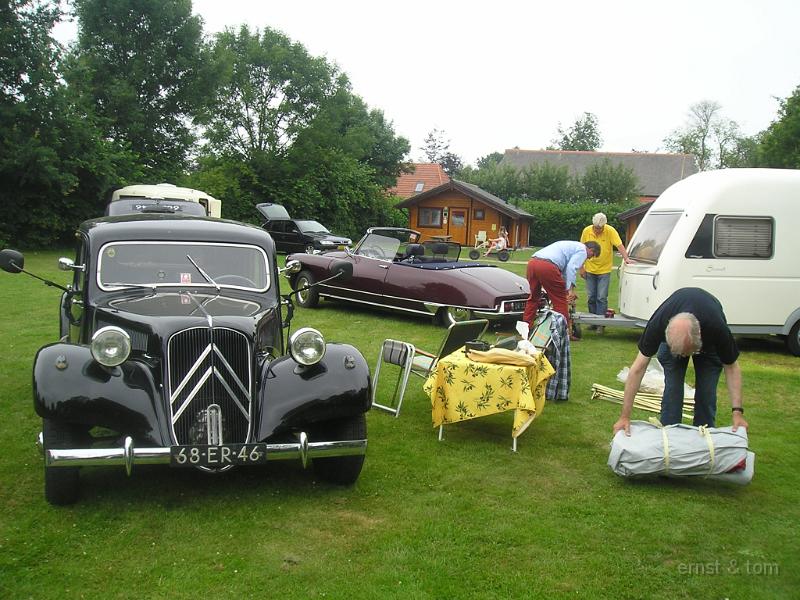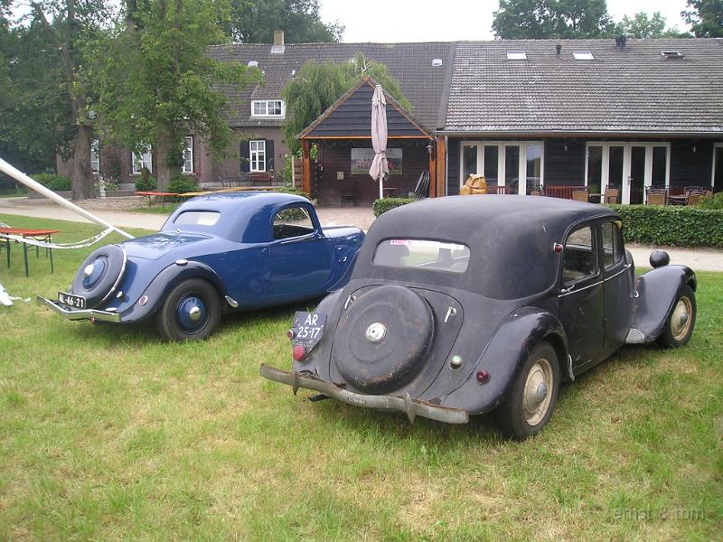 Hierna werd het kamp opgebroken en om 13.00 uur startte een internationale rit, waarbij conform de theory of constraints van managementgoeroe Goldratt de langzaamste auto voorop reed: Hans en Hanneke met daarachter de Kip Krielhen uit 1961. De sliert trok hiermee veel bekijks van omstanders. De rit voerde van Brabant naar Limburg, door Duitsland via Kleve en Emmerich naar Gelderland waar we via 's-Heerenberg de achterhoek in reden naar Hummelo. Hier was al 4 dagen een Fête Nationale aan de gang, waar wij als kers op de taart via een stoffig zandpad binnen reden en onze voitures opstelden naast Hotel/Restaurant de Gouden karper, die ons met een glaasje wijn verwelkomde. Meteen stonden er drommen mensen omheen die de berijders het hemd van het lijf vroegen. Gezien de tropische temperatuur die inmiddels was ontstaan was dat geen straf. Er stond ook een Peugeot 203 tussen onze Traxen en verderop een aantal 2CV's die ook te huur waren. In het dorp was een uitgebreide Brocante, overal klonk Franse muziek en in de plaatselijke kerk stond Bennie Jolink van Normaal schilderijen te beoordelen. Nog maar twee weken geleden was een klein groepje Gelre leden wezen høken in Toldiek, enkele kilometers verderop. Toen deze hierover vertelden bleek hier meer animo voor te zijn, dus als dat Normaal volgend jaar weer oerend hard optreedt zal de groep høkende Tractionrijders groter zijn. Diverse Gelre leden streken neer op een aangenaam terras en om 17.30 uur schoven we aan bij De Gouden Karper, waar een heerlijk Frans driegangen diner werd geserveerd met daarbij een drankje van het huis. Voldaan wilden we huiswaarts keren, maar Bert en Hennie Zantinge deden er nog een schepje bovenop door ons bij hen thuis uit te nodigen voor een kop koffie / thee met lekkere koek. De hele stoet trok dus van Hummelo naar Ellecom om daar nog een gezellig uurtje in de tuin door te brengen en het musée Quai de Javel te bekijken. De Trax van Tom klonk plotseling als een moderne C1 en had 25% vermogen minder. Uit een blik onder de motorkap bleek meteen dat er sprake was van sabotage, een lolbroek had een bougiekabel los getrokken zodat 1 cylinder geen medewerking verleende.