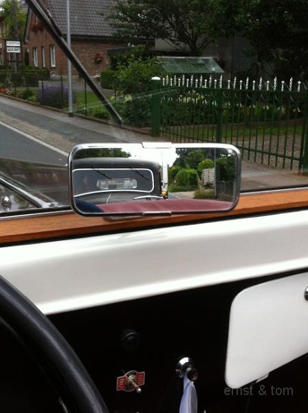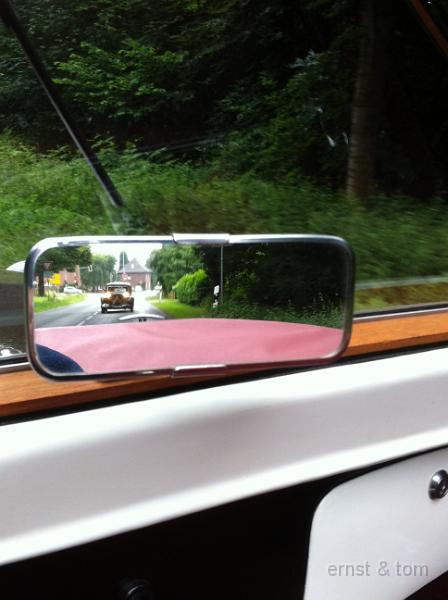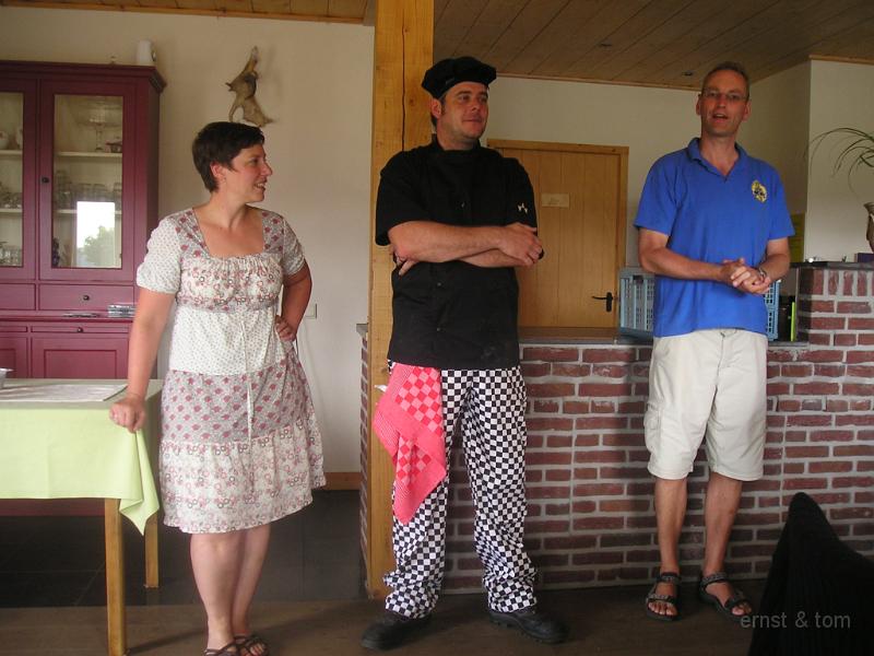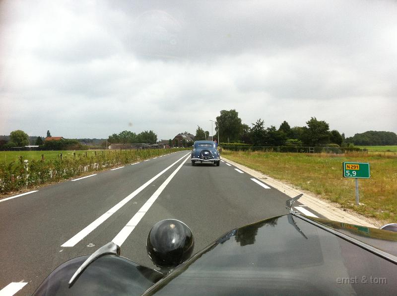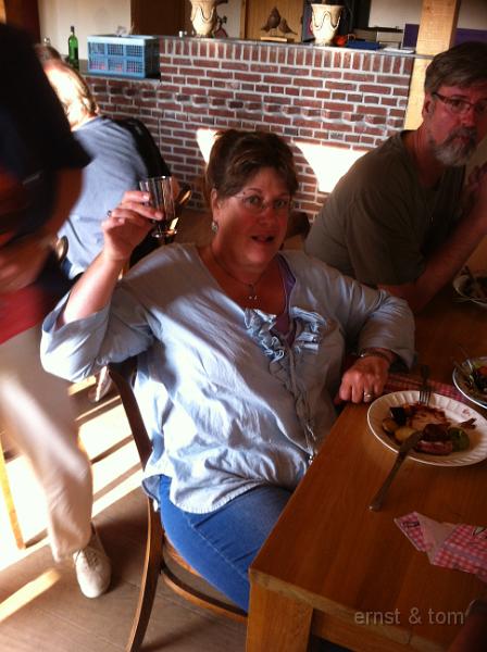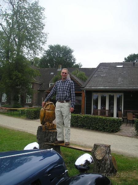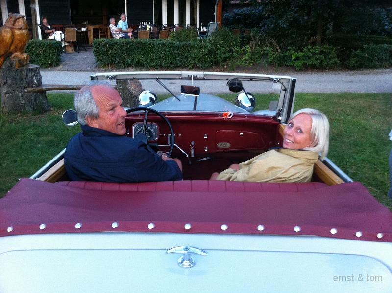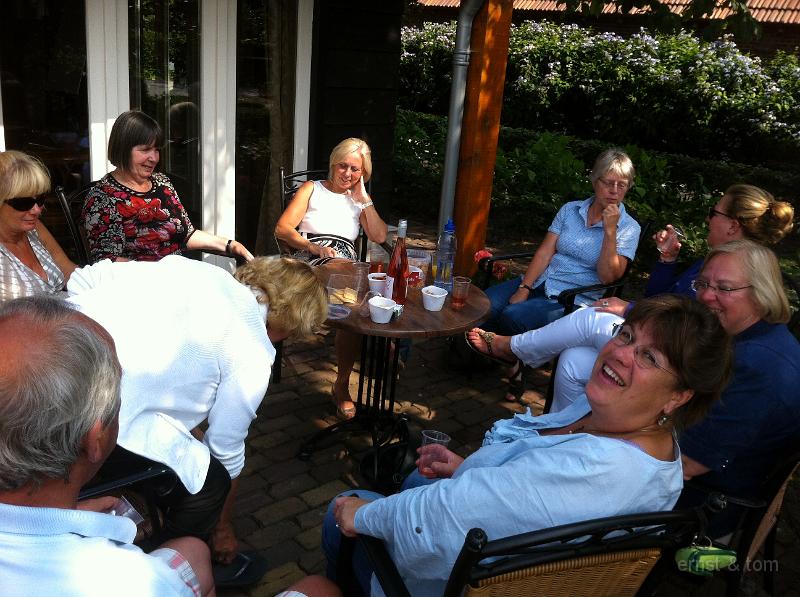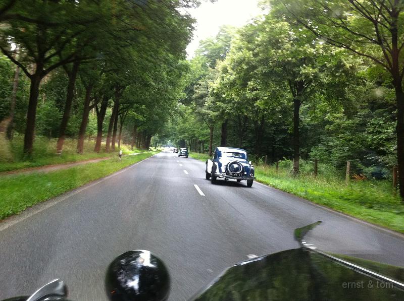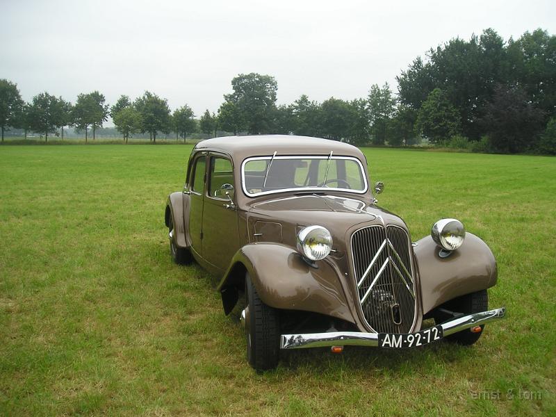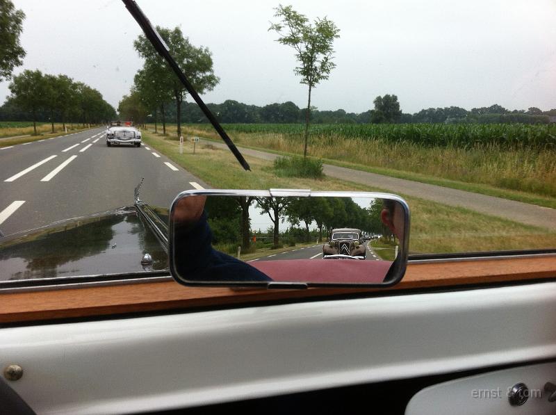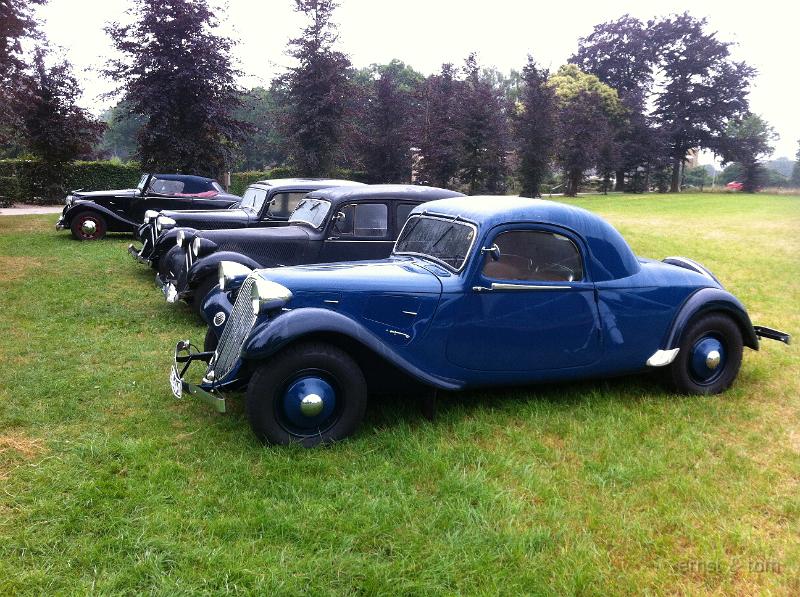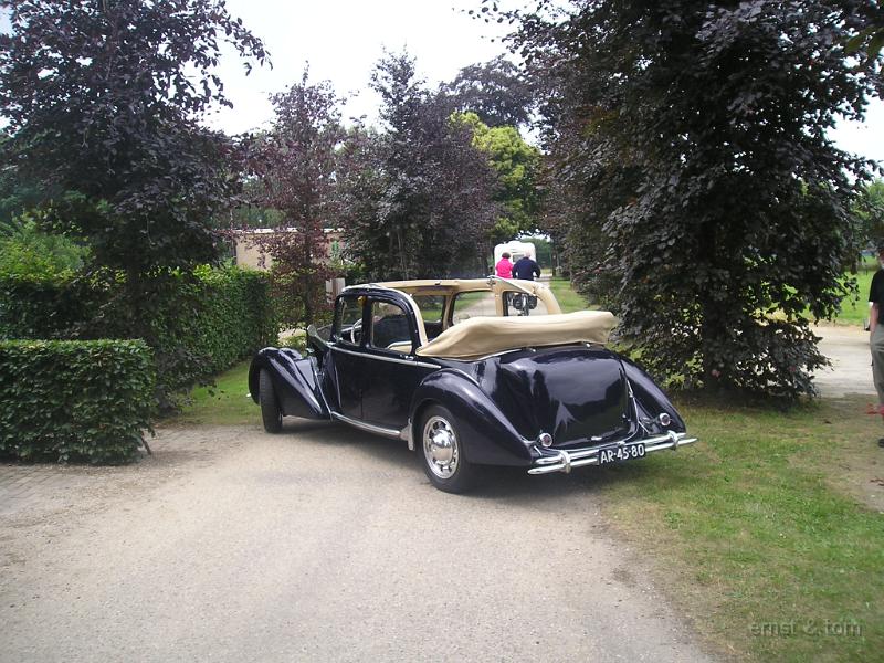 Hierna werd het kamp opgebroken en om 13.00 uur startte een internationale rit, waarbij conform de theory of constraints van managementgoeroe Goldratt de langzaamste auto voorop reed: Hans en Hanneke met daarachter de Kip Krielhen uit 1961. De sliert trok hiermee veel bekijks van omstanders. De rit voerde van Brabant naar Limburg, door Duitsland via Kleve en Emmerich naar Gelderland waar we via 's-Heerenberg de achterhoek in reden naar Hummelo. Hier was al 4 dagen een Fête Nationale aan de gang, waar wij als kers op de taart via een stoffig zandpad binnen reden en onze voitures opstelden naast Hotel/Restaurant de Gouden karper, die ons met een glaasje wijn verwelkomde. Meteen stonden er drommen mensen omheen die de berijders het hemd van het lijf vroegen. Gezien de tropische temperatuur die inmiddels was ontstaan was dat geen straf. Er stond ook een Peugeot 203 tussen onze Traxen en verderop een aantal 2CV's die ook te huur waren. In het dorp was een uitgebreide Brocante, overal klonk Franse muziek en in de plaatselijke kerk stond Bennie Jolink van Normaal schilderijen te beoordelen. Nog maar twee weken geleden was een klein groepje Gelre leden wezen høken in Toldiek, enkele kilometers verderop. Toen deze hierover vertelden bleek hier meer animo voor te zijn, dus als dat Normaal volgend jaar weer oerend hard optreedt zal de groep høkende Tractionrijders groter zijn. Diverse Gelre leden streken neer op een aangenaam terras en om 17.30 uur schoven we aan bij De Gouden Karper, waar een heerlijk Frans driegangen diner werd geserveerd met daarbij een drankje van het huis. Voldaan wilden we huiswaarts keren, maar Bert en Hennie Zantinge deden er nog een schepje bovenop door ons bij hen thuis uit te nodigen voor een kop koffie / thee met lekkere koek. De hele stoet trok dus van Hummelo naar Ellecom om daar nog een gezellig uurtje in de tuin door te brengen en het musée Quai de Javel te bekijken. De Trax van Tom klonk plotseling als een moderne C1 en had 25% vermogen minder. Uit een blik onder de motorkap bleek meteen dat er sprake was van sabotage, een lolbroek had een bougiekabel los getrokken zodat 1 cylinder geen medewerking verleende.