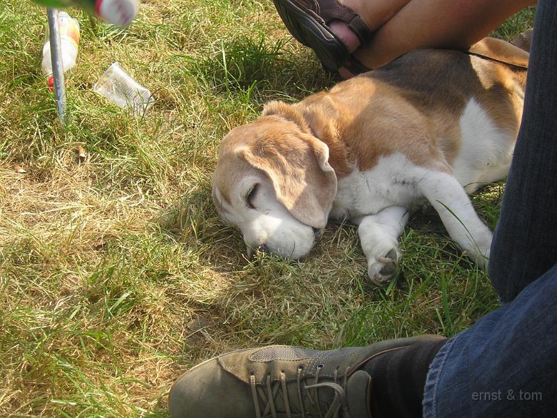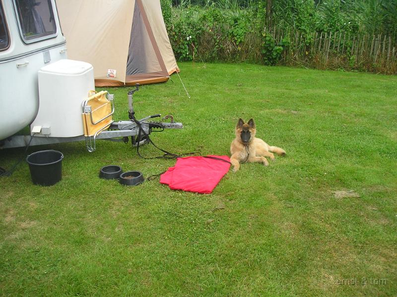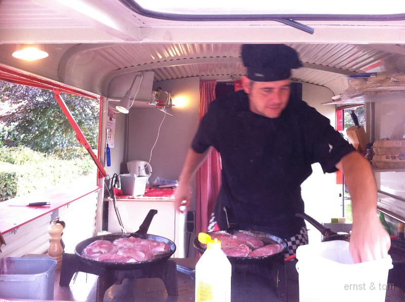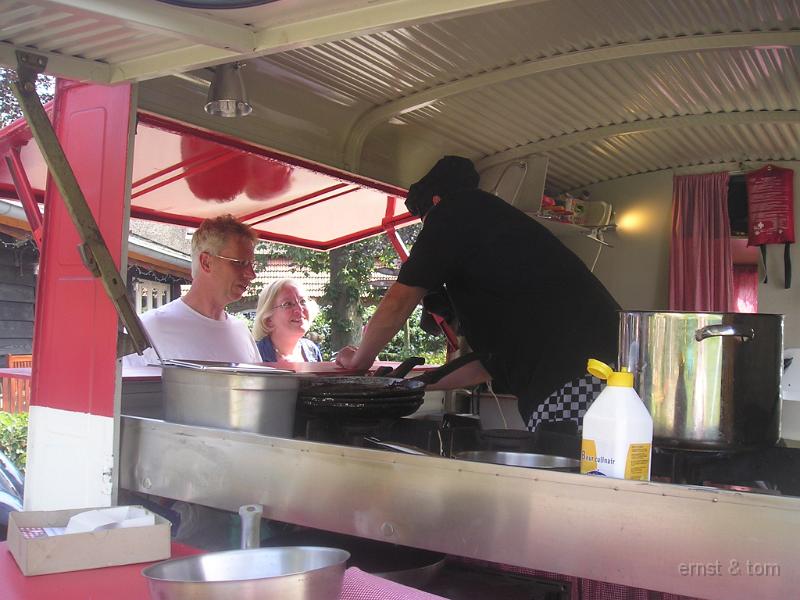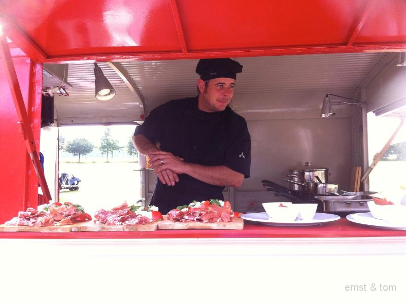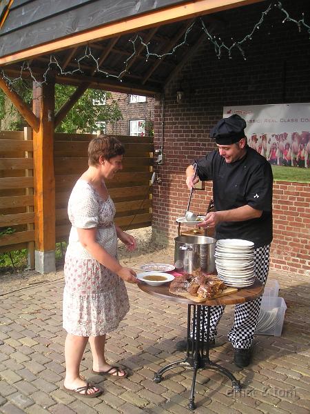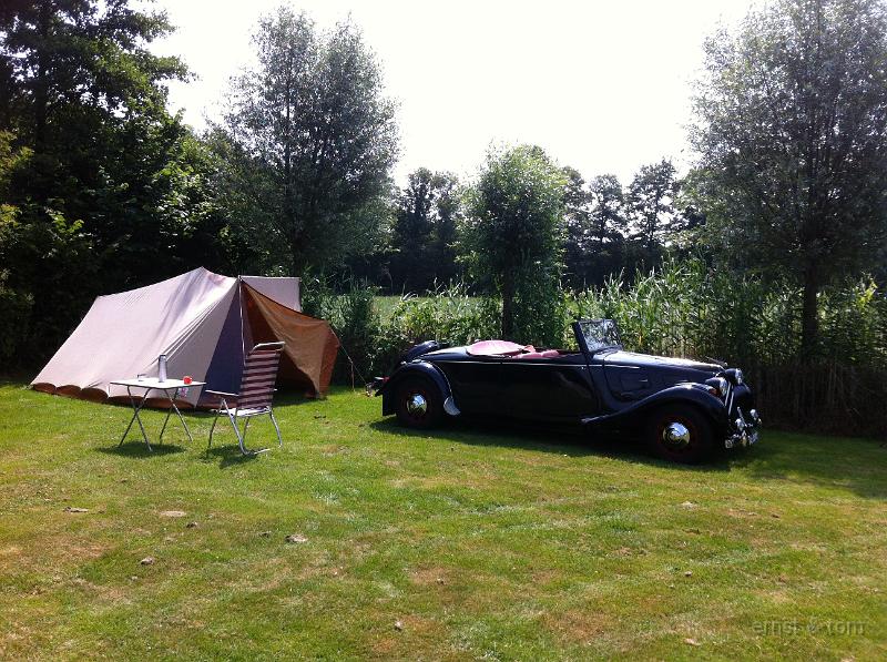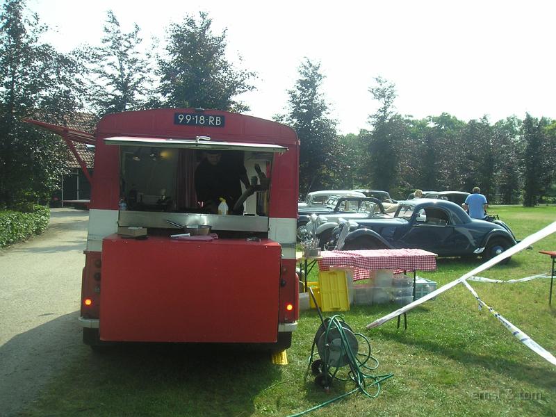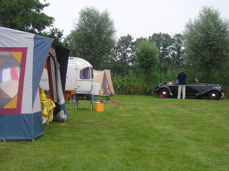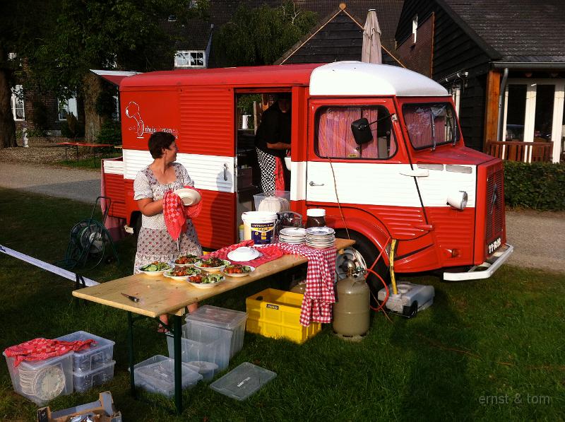 Zelfs de party-tent had Robri's! Zoals zo vaak waren de weersgoden ons weer zeer goed gezind! Op die prachtige zonnige zaterdag 13 juli verschenen er rond het middaguur al diverse tractions op het prachtige Landgoed Barendonk in Beers, een hoog cabrio-gehalte bovendien! Na aanmelding /inschrijving gingen de kampeerders hun tentjes opzetten of zochten een mooi plekje voor hun oude dan wel nieuwe Biod caravan, ook een kriel-KIP van de partij en verder een prachtige Jumper camper! Allemaal bijeen op één veldje. De tractions stonden opgesteld op het gras bij de inrit, daar werd ook al flink geborreld > Ria was jarig en na felicitatie wachtte een lekkere rosé! Tegen 15.00 h verscheen de rode catering-HY, deze werd naast ons zaaltje met terras opgesteld. Even later kwam ook de Six gevuld met de Reparons en de afdelingsdrank aanrijden! Kok Gert Jan begon al met zijn de voorbereiding en in no time kwamen er al heerlijke geuren uit zijn rijdende keuken! Steeds meer leden kwamen erbij, sommigen om gewoon even gezellig te buurten. Voor het diner bijna 30 eters, ook uit afdeling Oost en Zuid! Op de camping 2 tenten, 3 caravans en 1 camper bewaakt door in totaal 4 honden!
