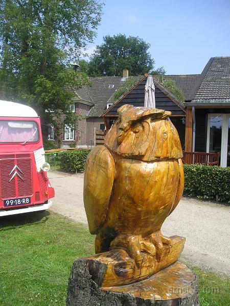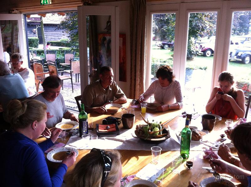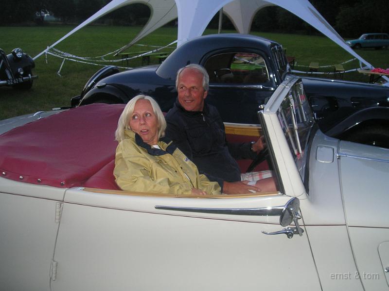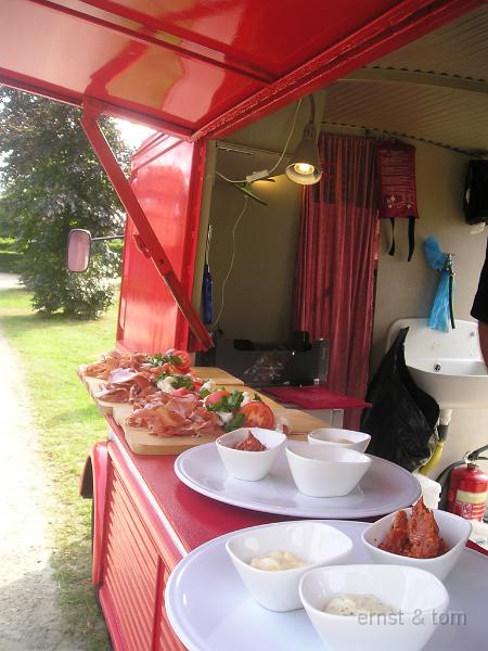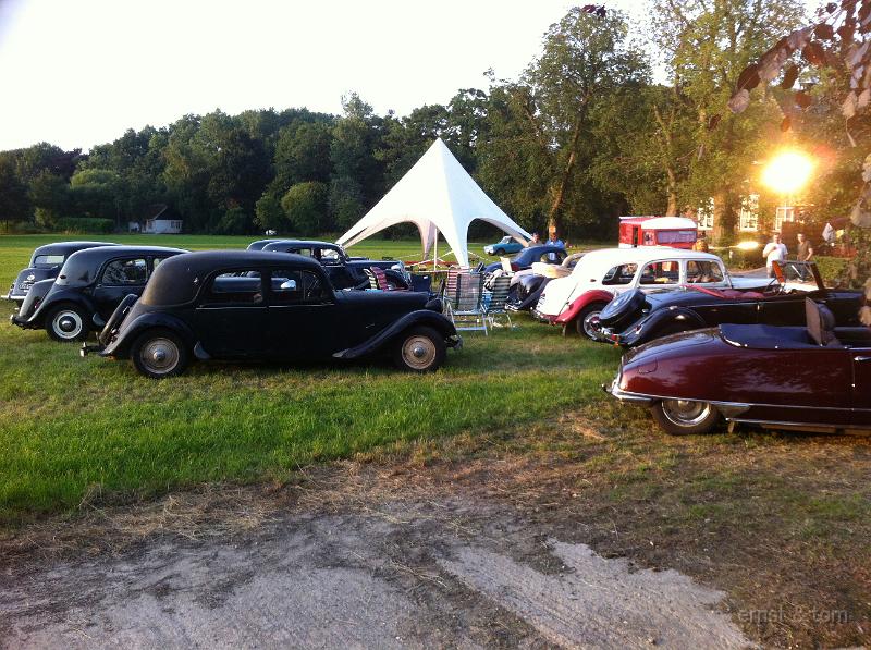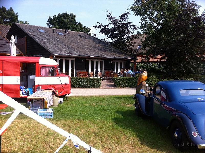 Diverse voorgerechtjes, Franse uiensoep, 2CV borst met dopperwten-munt puree / salades/ aardappel-garnituur, crèpes met amandelen, amaretto en ijs, kaasplankje. Al dit lekkers kwam vanuit de rode HY, steeds met uitleg door de kok Gert Jan en vlot uitgeserveerd door Aniek! Chapeau! Dit alles voorzien van een lekkere Merlot of gekoelde rosé maakten het tot een waar feestmaal! Het bleef lang gezellig met mooi uitzicht op de tractions in het licht van de ondergaande zon! Nadat de "thuis-slapers" vertrokken waren bij de tent nog even gezellig na-geborreld met weer wat andere specialiteiten, daarna dormir .... Rustig en relaxed opstaan, gewekt door de vele vogeltjes, prachtige camping! Even de bestelde verse croissantjes en een pistoletje halen bij de receptie, je waande je soms echt echt even in Frankrijk. Om 11 h maakten we de dag goed van een groep gehandicapten die ook op de camping verbleven door een ritje met ze te rijden. Inmiddels waren ook wat andere leden verschenen die aan de rit naar de frans dag in Hummelo gingen deelnemen. Na toespraak door Tom naast de wijze uil vertrok de kleurrijke stoet richting het oosten. Na ontbijt en koffieklets verzamelden zich rond 11.00 uur meer Tractions, die 12 verstandelijk gehandicapten en 5 begeleiders, die ook op het landgoed vertoefden, een rondritje door de omgeving aanboden. Dit werd zeer gewaardeerd en was voor de meesten een niet te vergeten belevenis.