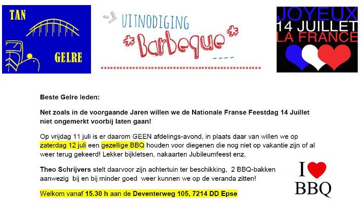 Ook dit jaar hebben we de Nationale Franse Feestdag niet ongemerkt voorbij laten gaan. Kregen zeer spontane reactie van Theo en Maria Schrijvers dat we welkom voor een BBQ waren in hun achtertuin op zaterdagmiddag 12 juli.