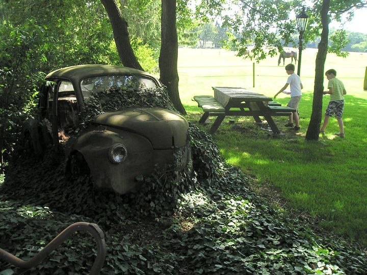 De achtertuin was inderdaad groot genoeg! Prachtig vrij uitzicht op een flink aantal paarden bovendien en elders in de tuin stond ook nog een bijna door de natuur teruggenomen Renault Quatre! In Theo's garage staat al een tijdje een beter exemplaar, - gespoten carrosserie - te wachten om weer opgebouwd te worden. Ook liefhebber van oude Mercedessen, zowel van schaalmodellen als van echte! De Traction stond onder de carport.