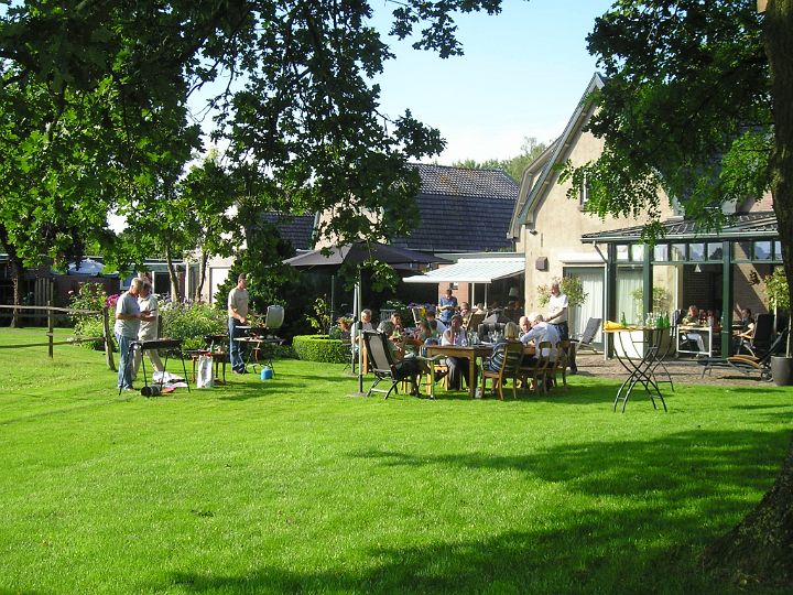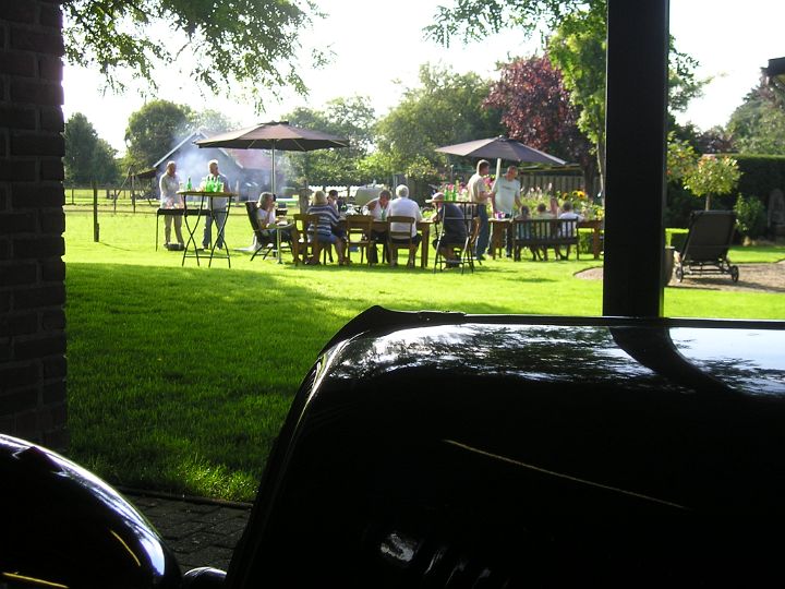 Uiteindelijk 20 volwassenen en 3 kinderen in de tuin, diverse tafels, parasols en inderdaad een dubbele Weber ( met wat startproblemen) Met vereende krachten van de superstokers werden de BBQ warm gestookt. In de keuken stond een enorme schaal met vers aangemaakte salade, diverse vleessalades, groente, stokbrood, drank - alles prima verzorgd door Theo en Maria. Zelfs frietjes voor de kinderen.