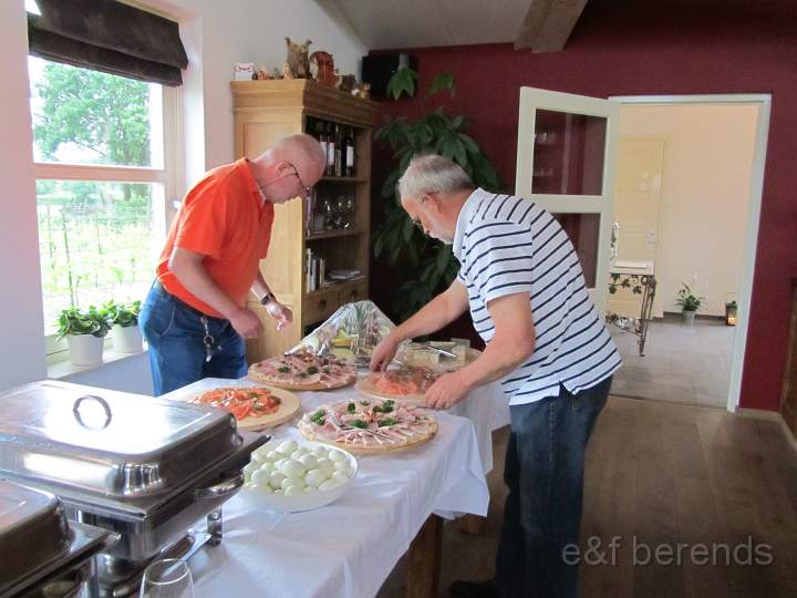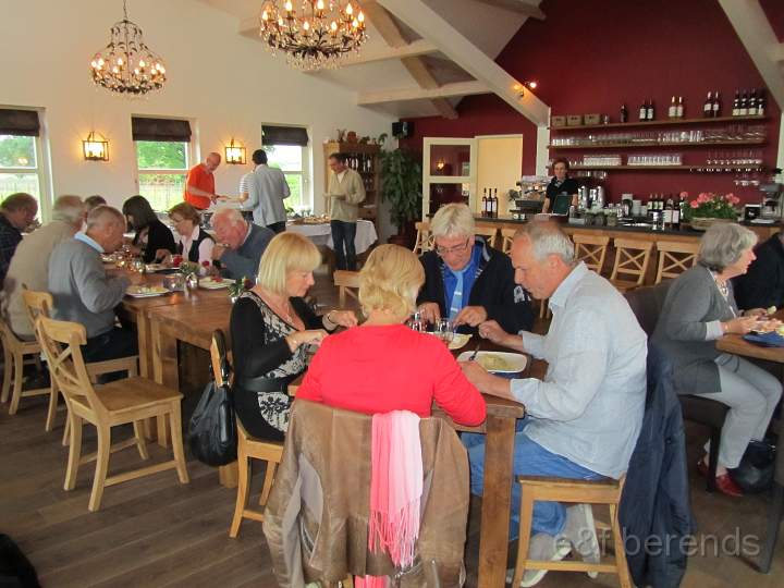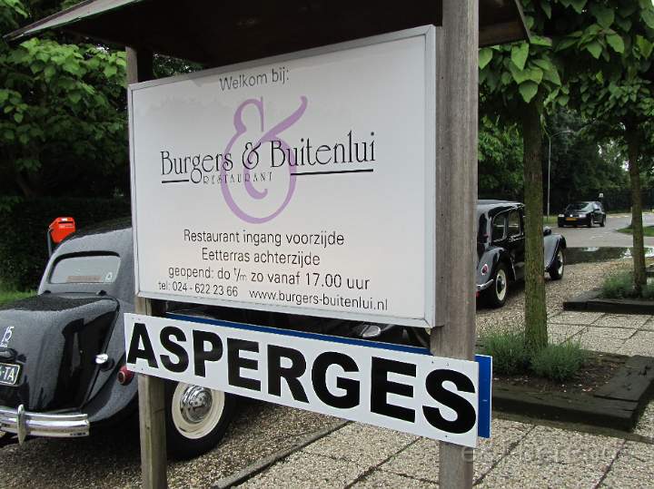 Zondag 1 juli. Na en prachtige zaterdag is het vandaag zwaarbewolkt, koud en het regent. Rond een uur of een komende deelnemers voor de aspergerit aan in Nederasselt bij café restaurant Burgers en Buitenlui bijelkaar. Koffie met gebak wordt geserveerd. Door de vele regen heeft Richard de route wat aangepast zodat we niet de modder blijven steken. De rit is daardoor wel een beetje korter geworden dus hebben nog even tijd om nog een extra drankje te nemen. Na een niet al te lange rit waar een enkeling ook nog verkeerd reed komen we aan in Groesbeek bij de Wijnhoeve "De Heikant". Na een wijntje arriveert de catering met asperges en meer. Jan en Richard scheppen op en we laten het ons goed smaken. Tegen halfzeven is iedereen voldaan en gaat een ieder huiswaarts.