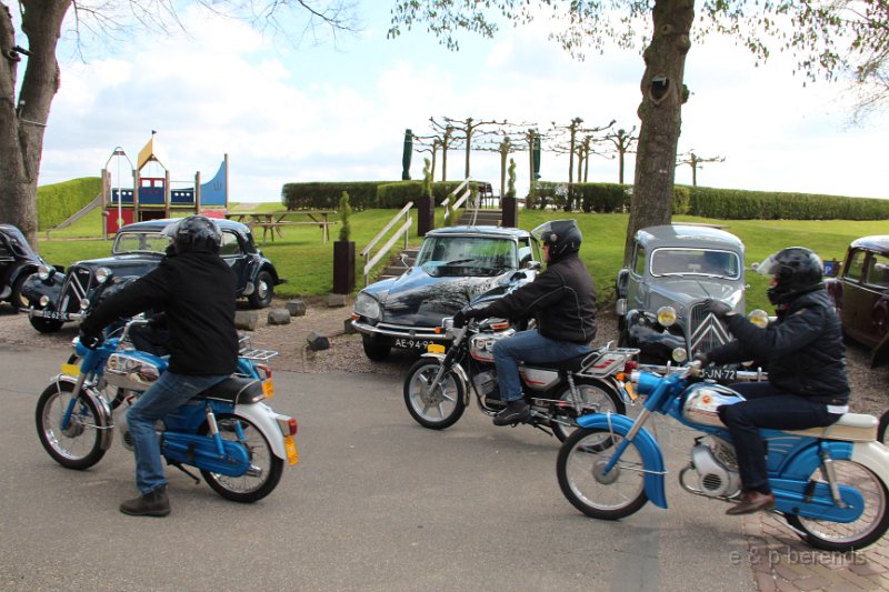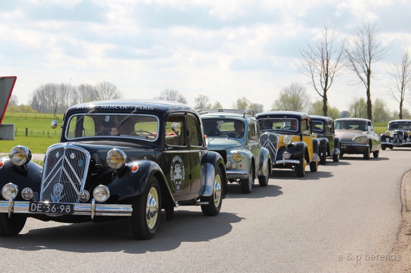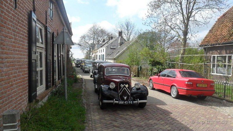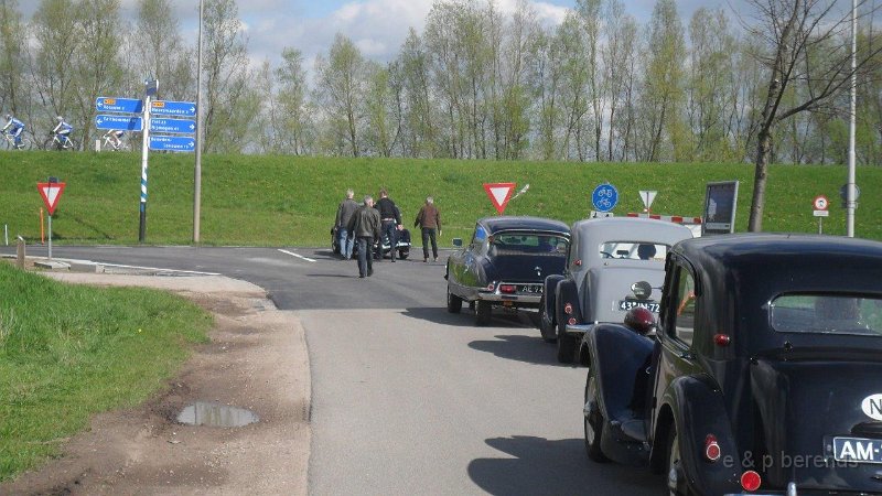 Zondagmorgen 28 april, zowaar lentezon op de P-plaats bij Mac Donalds in Ochten, uiteindelijk hadden er zich ca 25 equipes aangemeld voor de gezamenlijke VJ rit van Gelre & Midden. Behalve vele (kleurige) tractions ook één fraaie oude R4 en een zwart-wit DS duo! Snel weg van de snelweg en rustig toeren over Maas - en Waaldijken , door nog slaperige oude dorpjes en stadjes, vele fraaie panden en kasteeltjes langs de route. Onze belofte was waargemaakt overal volop bloesem! Op een flink stuk onverharde weg moesten de fietsers even plaats maken, sorry.....